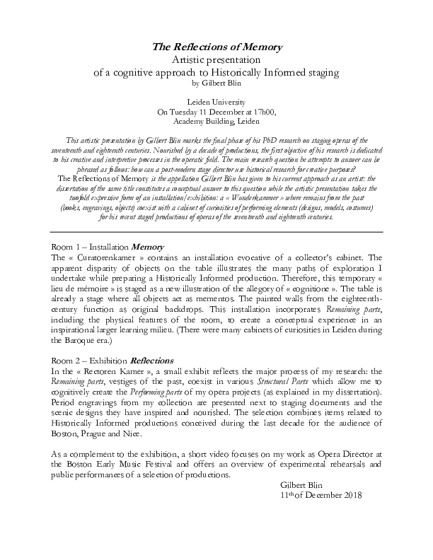 The research is dedicated to Gilbert Blin’s work in staging operas of the seventeenth and eighteenth centuries. Nourished by a decade of productions for the Boston Early Music Festival, the first objective of his dissertation is to enable a better understanding of both his creative and interpretive processes in the operatic field. The main research question he attempts to answer in his dissertation can be phrased as follows: how can a post-modern stage director use historical research for creative purposes? The title of this dissertation, The Reflections of Memory, is the appellation Gilbert Blin has been giving to his current approach as an artist and constitutes a conceptual answer to this question.