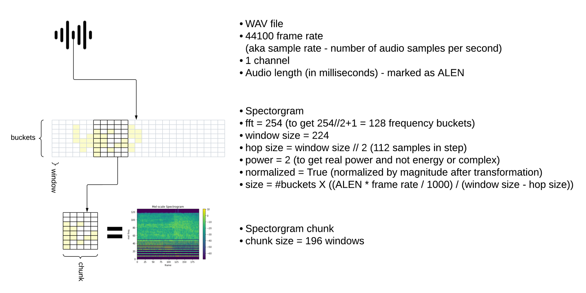 For a spectrograms with 128 buckets and chunk size of 196, will be (128, 196)