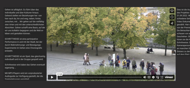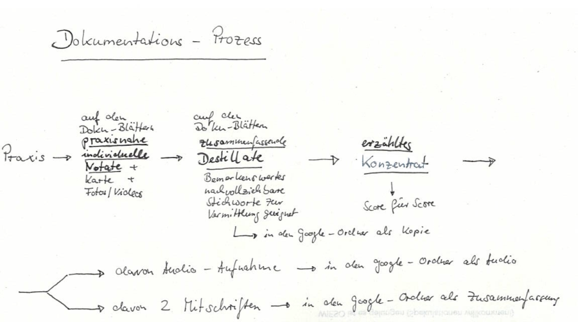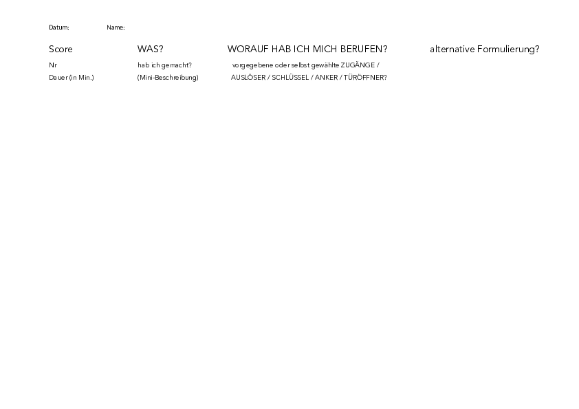 Einen Lageplan anfertigen Auf dem Lageplan die Wege einzeichnen, die du während der Experimente/Scores gehst Wichtige Orte / Momente / Begegnungen skizzieren, ggf auch Worte nutzen Ein Foto machen > aus der Praxis heraus / nach der Praxis Ein Video machen > aus der Praxis heraus / nach der Praxis Scores aufschreiben Erfahrungen aufschreiben Assoziationen aufschreiben Reformulierungen der Scores aufschreiben Eine Audio-Aufnahme machen