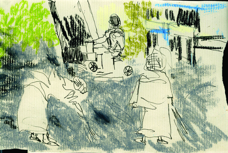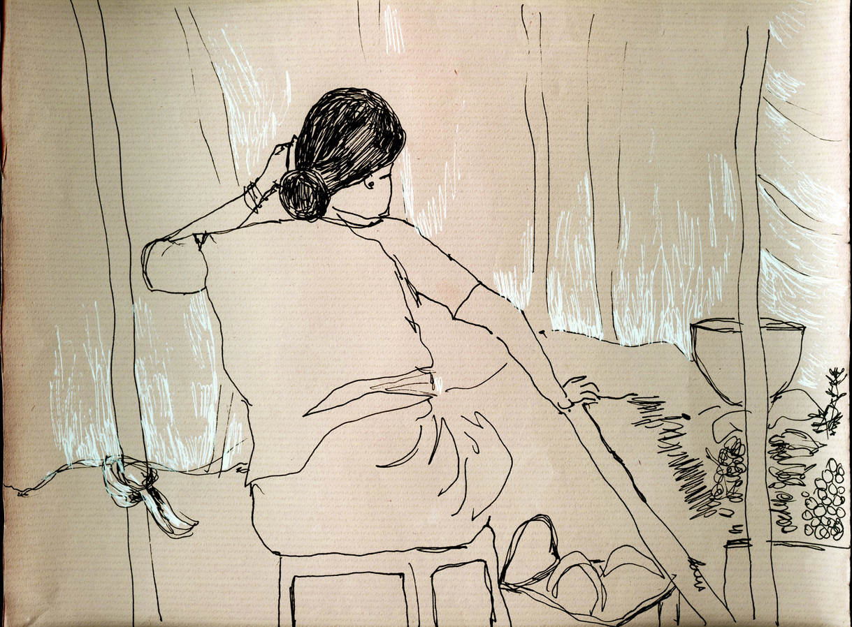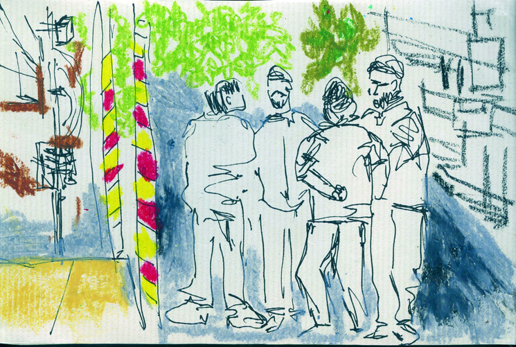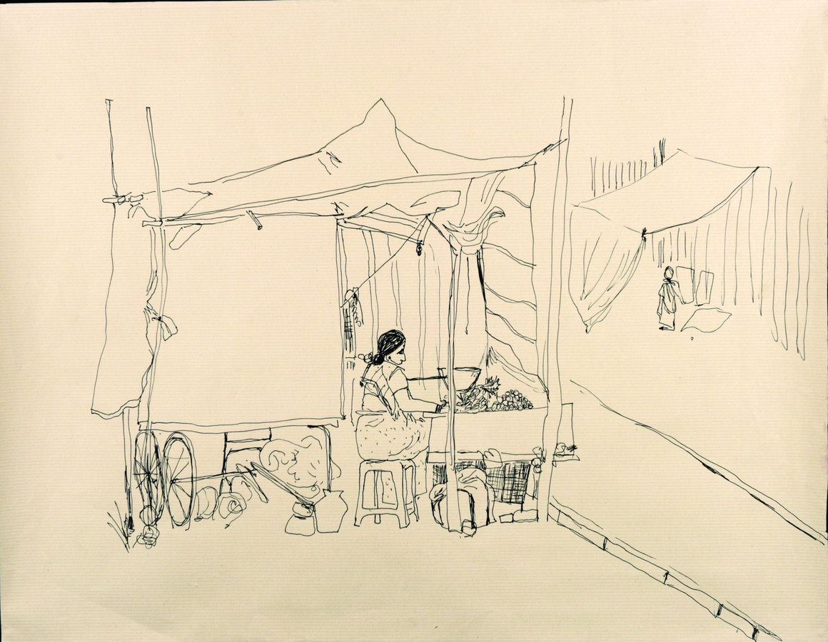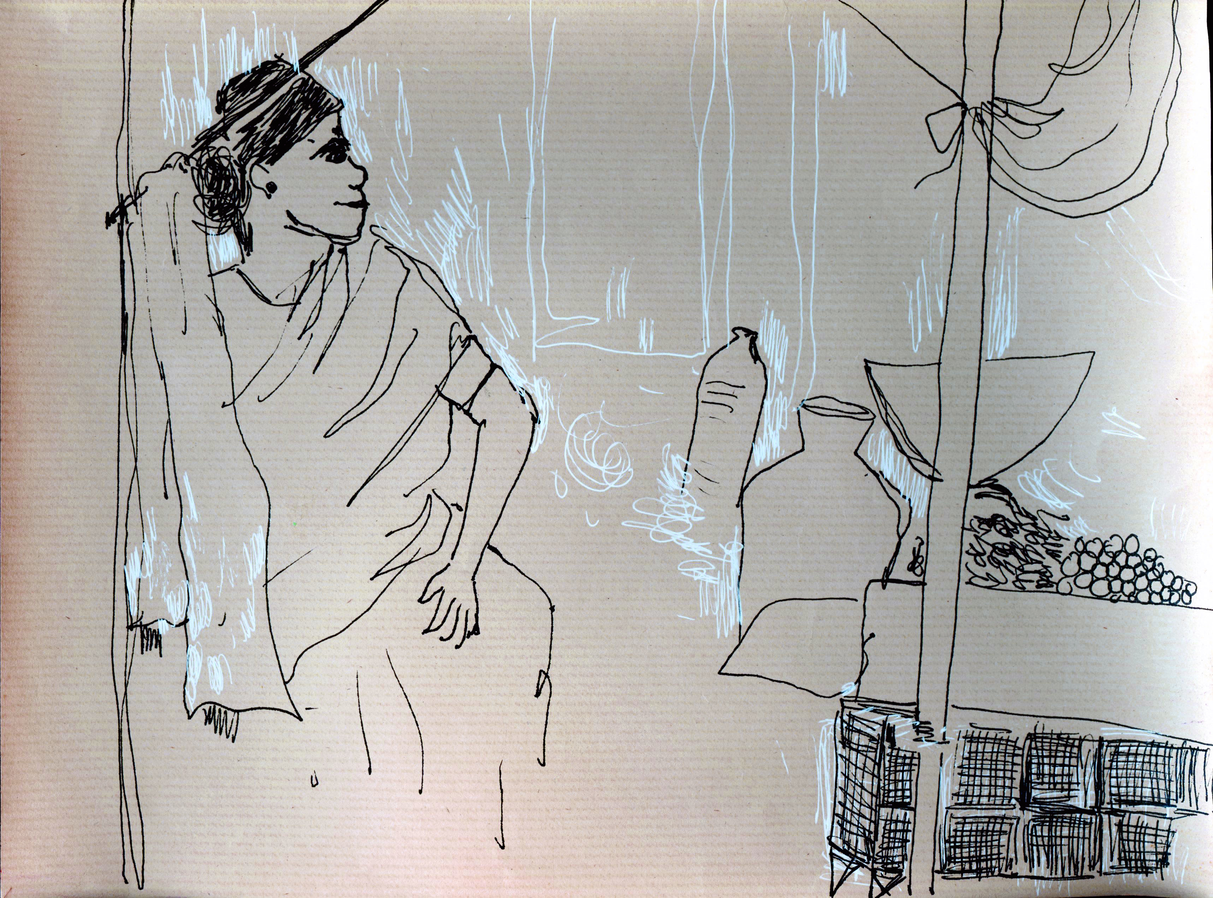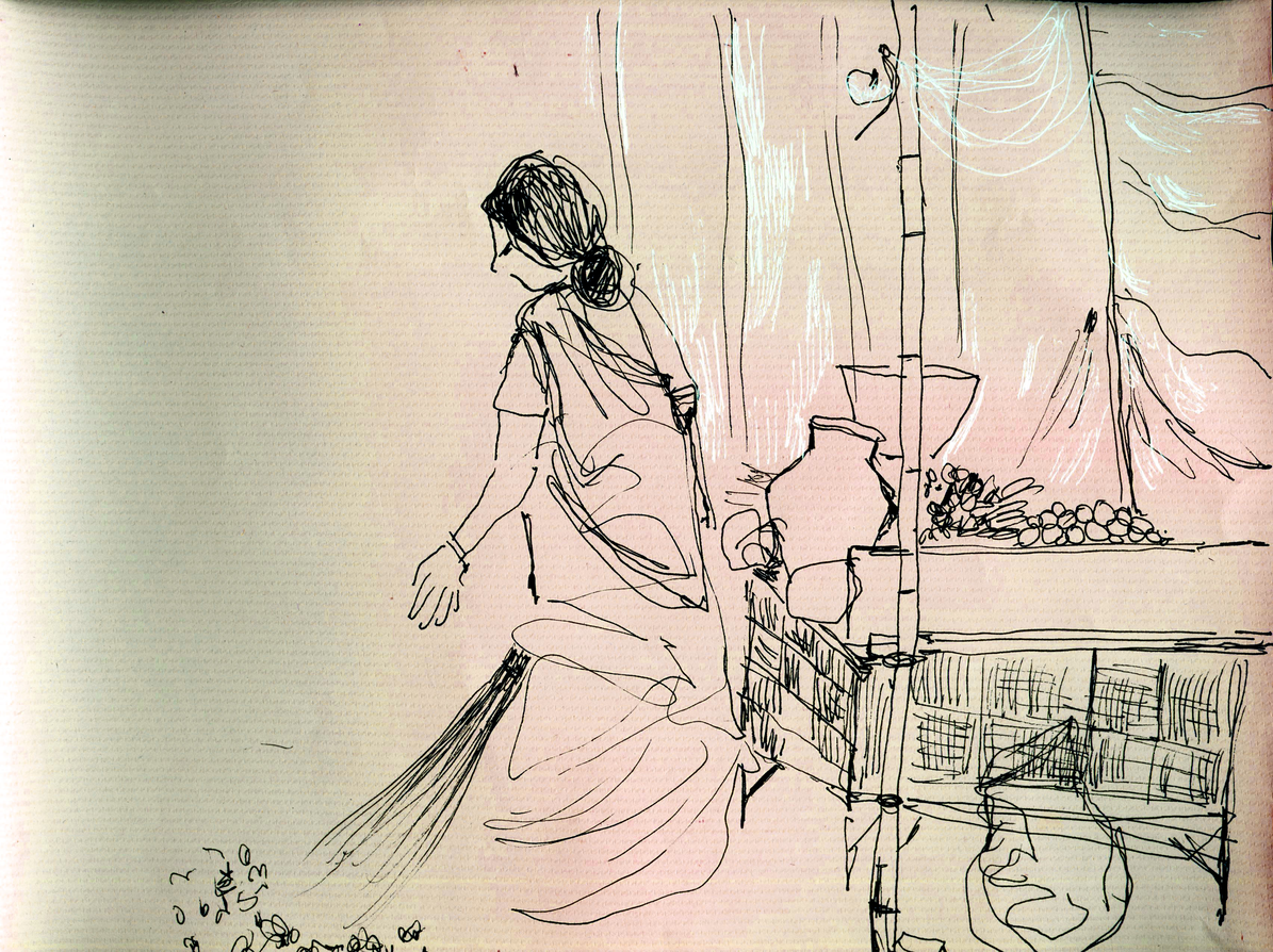 The exposition is presented through four sections of drawings and an audio-visual work that elaborate upon the idea of being in the moment with repeated observations of one space through drawing as medium. The first section 'Arriving' reflects the process of observation that started from where I sat and developed further as I looked at the arrangements around of people and space. Moving away from the pre-decided plan of observation, the immersion into space took place through the act of looking and drawing . The second section features four drawings of the same place in a bigger place where I began observing parts and the whole, trying to connect the lines and details as I understood them in relation with each other. The third section highlights a big idea that emerged after I did the drawings of presences and absences as they occured on the street while the last section documents exampls of close observations of micro spaces on the street where I started to look deeper into crevices. The moment of connectedness with the outside connects me to spaces within, as the drawings hang in moment, in the tension between the before and the after , between the early and the late. They also hang between the inside and the outside.