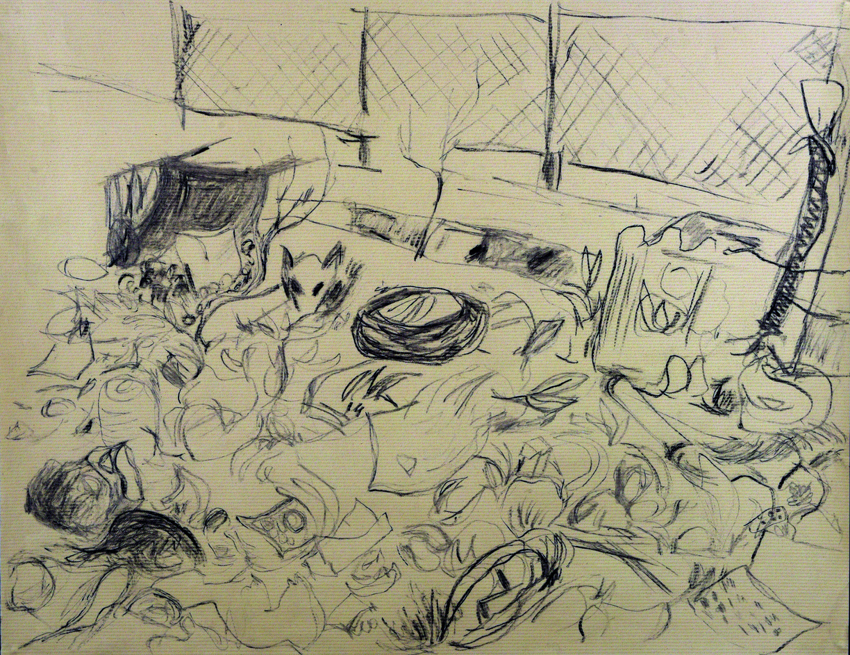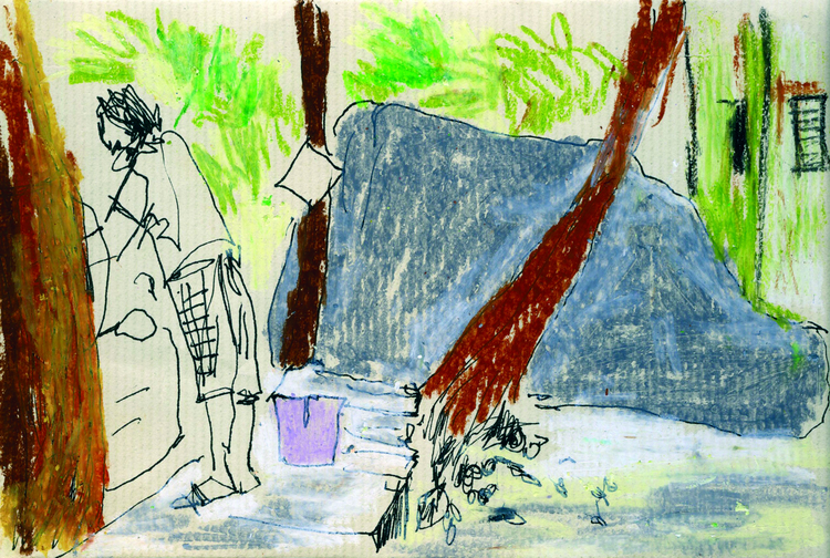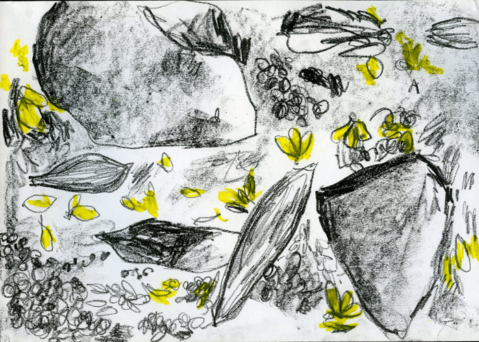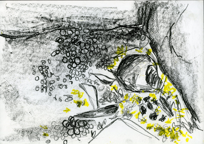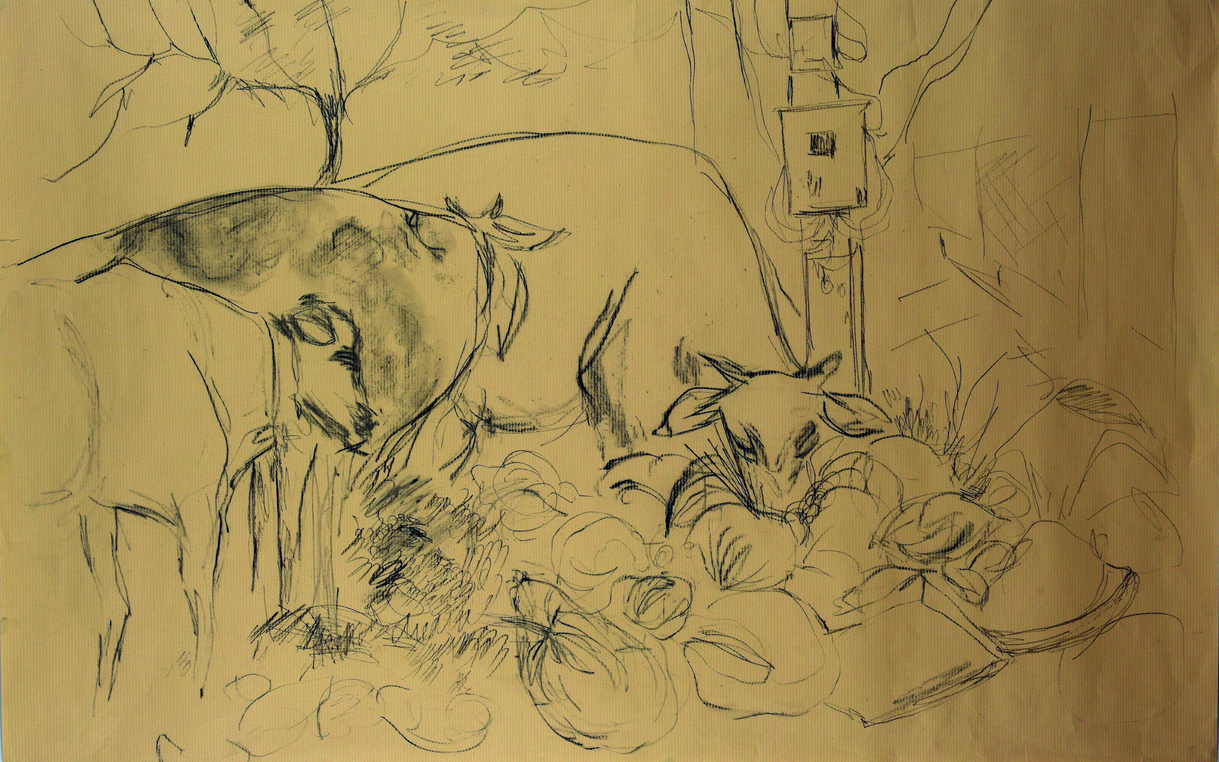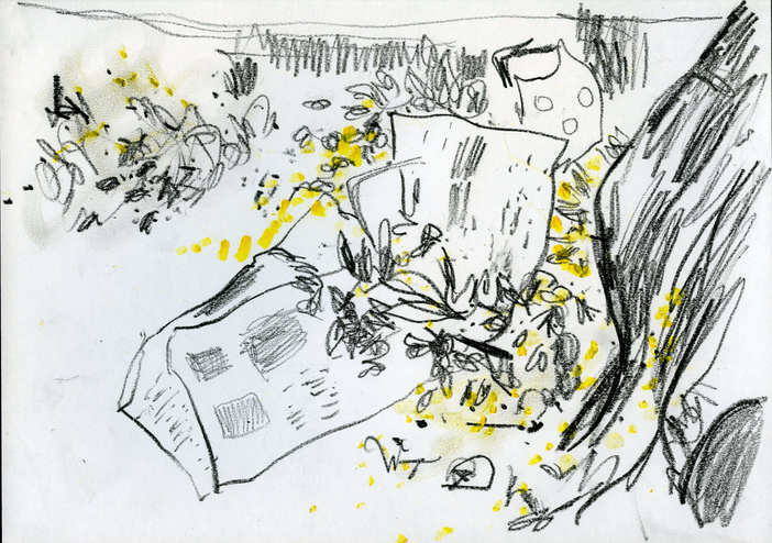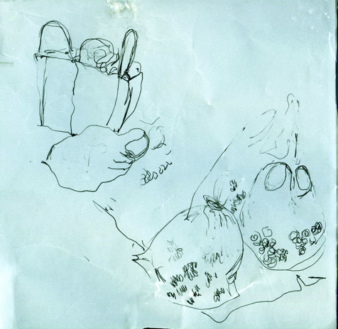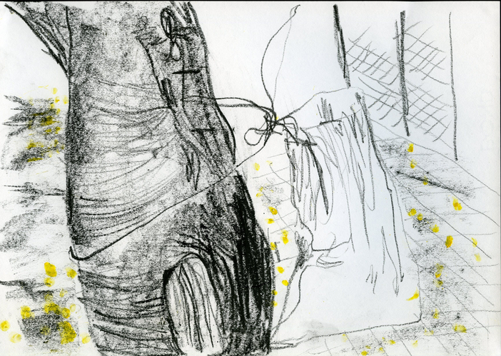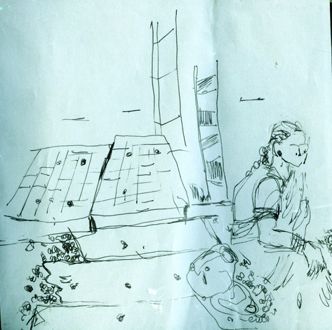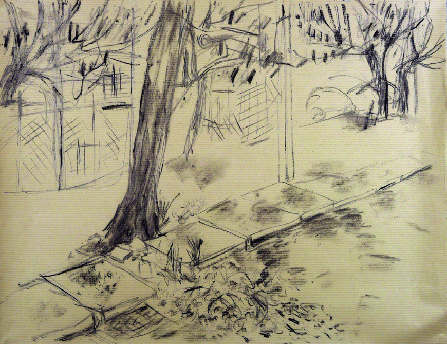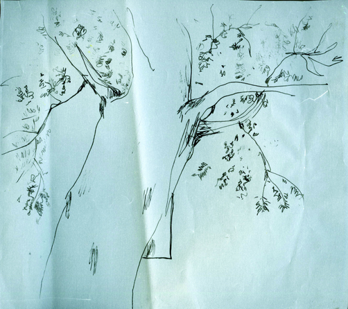 The exposition is presented through four sections of drawings and an audio-visual work that elaborate upon the idea of being in the moment with repeated observations of one space through drawing as medium. The first section 'Arriving' reflects the process of observation that started from where I sat and developed further as I looked at the arrangements around of people and space. Moving away from the pre-decided plan of observation, the immersion into space took place through the act of looking and drawing . The second section features four drawings of the same place in a bigger place where I began observing parts and the whole, trying to connect the lines and details as I understood them in relation with each other. The third section highlights a big idea that emerged after I did the drawings of presences and absences as they occured on the street while the last section documents exampls of close observations of micro spaces on the street where I started to look deeper into crevices. The moment of connectedness with the outside connects me to spaces within, as the drawings hang in moment, in the tension between the before and the after , between the early and the late. They also hang between the inside and the outside.