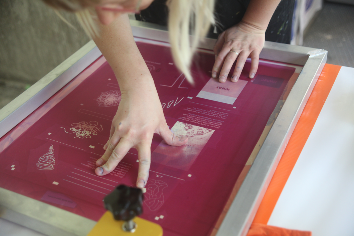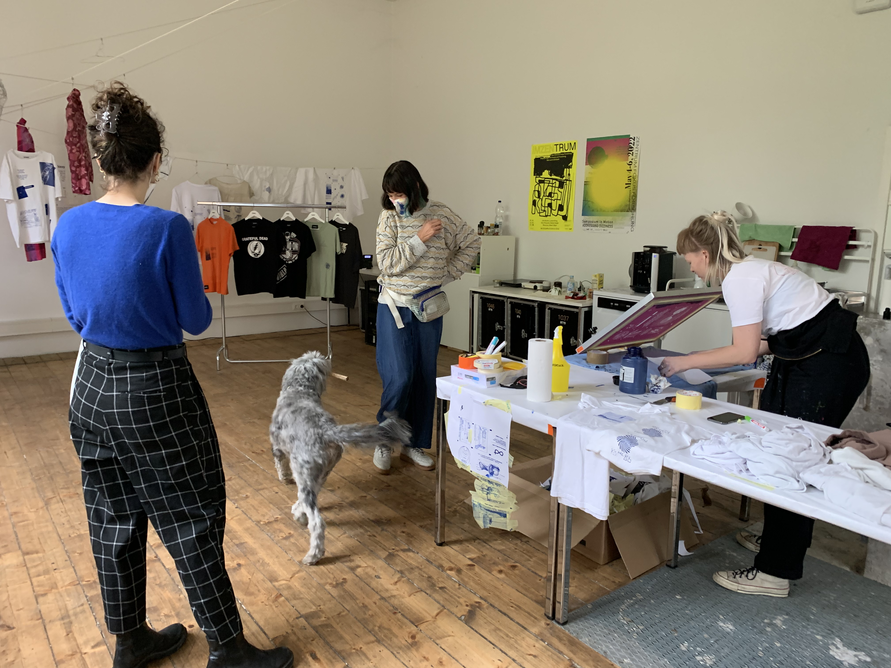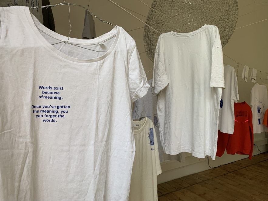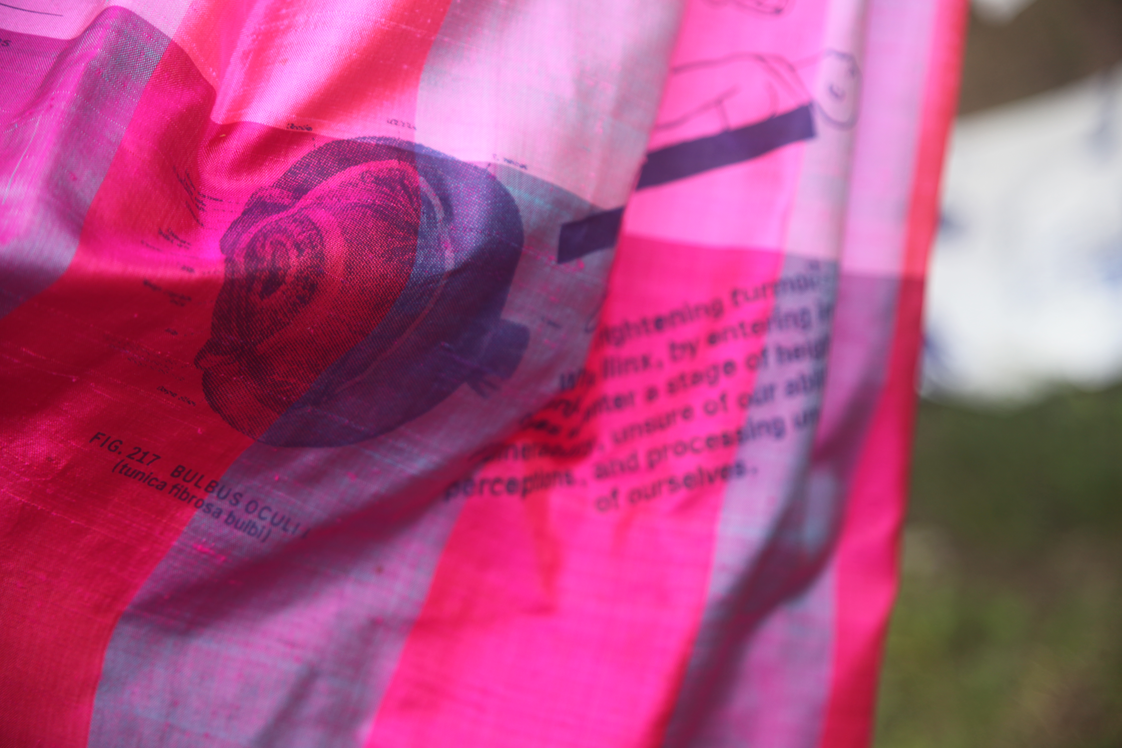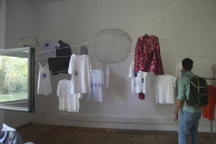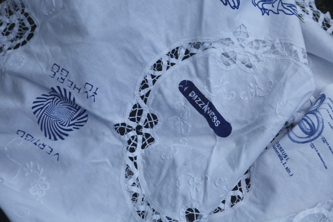 The on-sight installation implemented by Christian Hoffelner during the symposium days operates as a collaborative initiative involving Katrin Heinlein (Mikrodruck, Kunstuniversität Linz), the team of Navigating Dizziness Together, the guests and speakers at the symposium, and a selected group of students from Christine Böhler’s (Luca Hierzenberger, Daniel Hüttler, Friederike Teller, Jana Weissteiner, Samo Zeichen) Cross-Disciplinary Strategies (die Angewandte). The integrated DIY-Screen-Printing-Unit produces narratives with typographic modules on secondhand textiles. These customized combinations of emblems, texts, or dizzying imagery and research, are meant to be worn – carried out of the bubble. The production was conceived as a collective project, which is practically longing for multiple authorship and 'tentacular maneuvers.' Garments are dried in the garden on a temporarily erected clothesline.