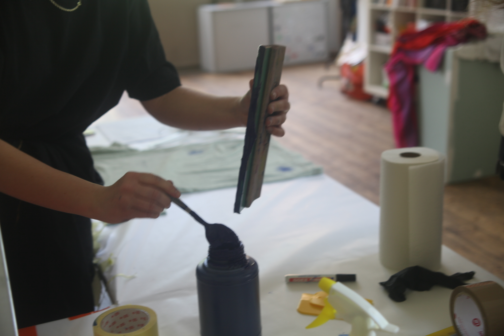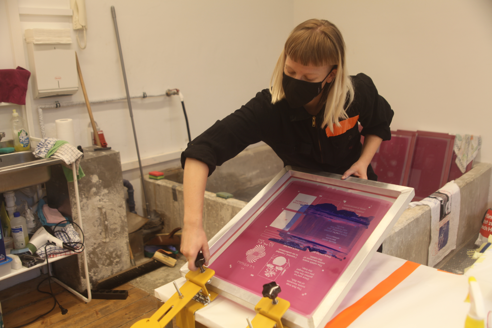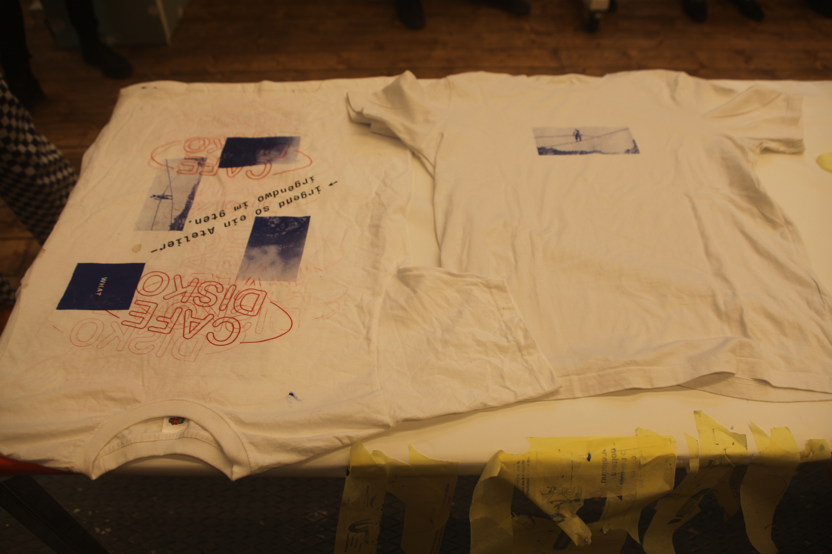 The on-sight installation implemented by Christian Hoffelner during the symposium days operates as a collaborative initiative involving Katrin Heinlein (Mikrodruck, Kunstuniversität Linz), the team of Navigating Dizziness Together, the guests and speakers at the symposium, and a selected group of students from Christine Böhler’s (Luca Hierzenberger, Daniel Hüttler, Friederike Teller, Jana Weissteiner, Samo Zeichen) Cross-Disciplinary Strategies (die Angewandte). The integrated DIY-Screen-Printing-Unit produces narratives with typographic modules on secondhand textiles. These customized combinations of emblems, texts, or dizzying imagery and research, are meant to be worn – carried out of the bubble. The production was conceived as a collective project, which is practically longing for multiple authorship and 'tentacular maneuvers.' Garments are dried in the garden on a temporarily erected clothesline.