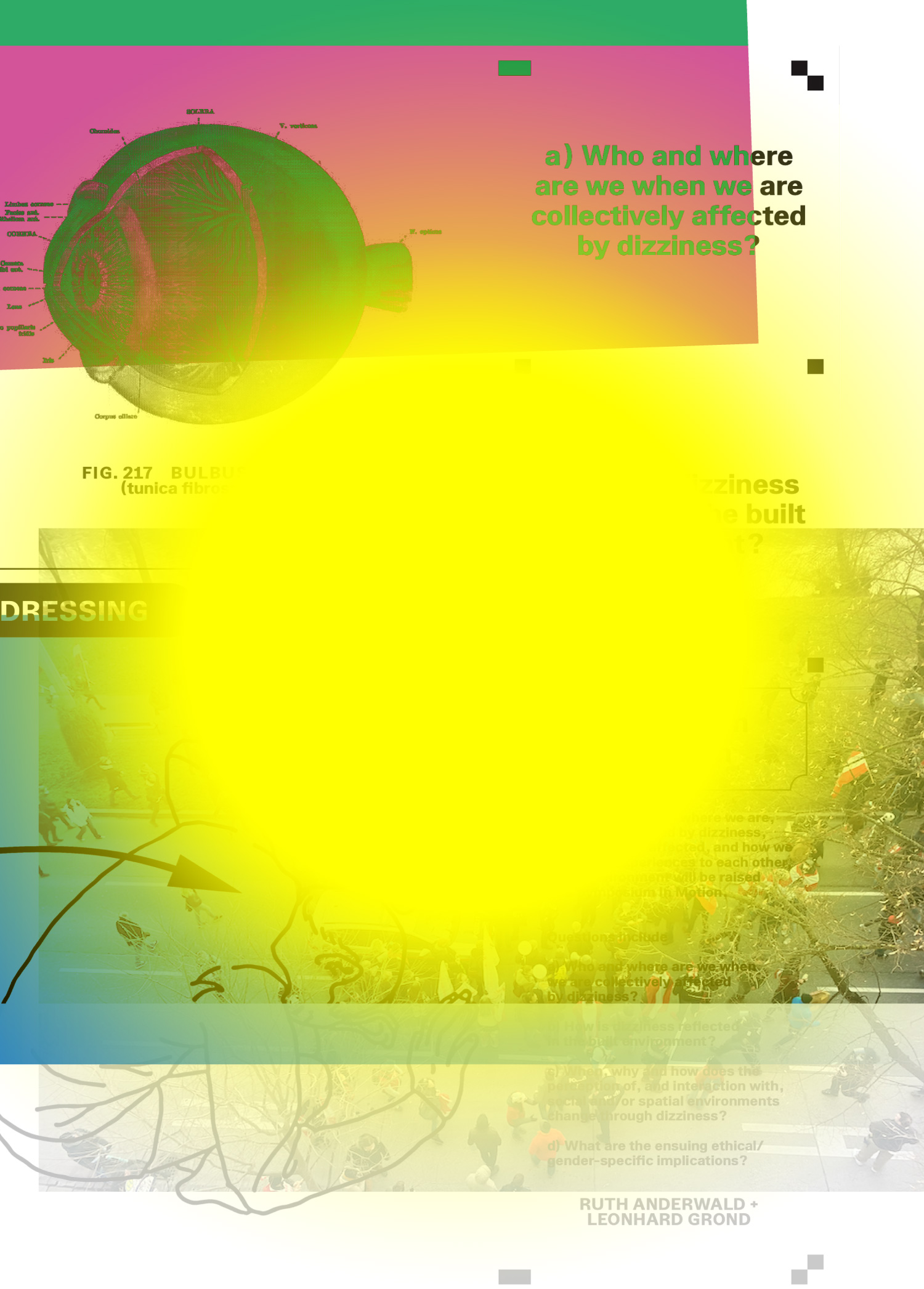 We understand dizziness as an unpredictable motion, or the illusion of such a motion, causing a shift from the given to the uncertain. This shift unbalances us as individuals, groups, and societies. As we try to get a grip, find out feet, and balance again, we find ourselves exposed to both destructive and generative dynamics.