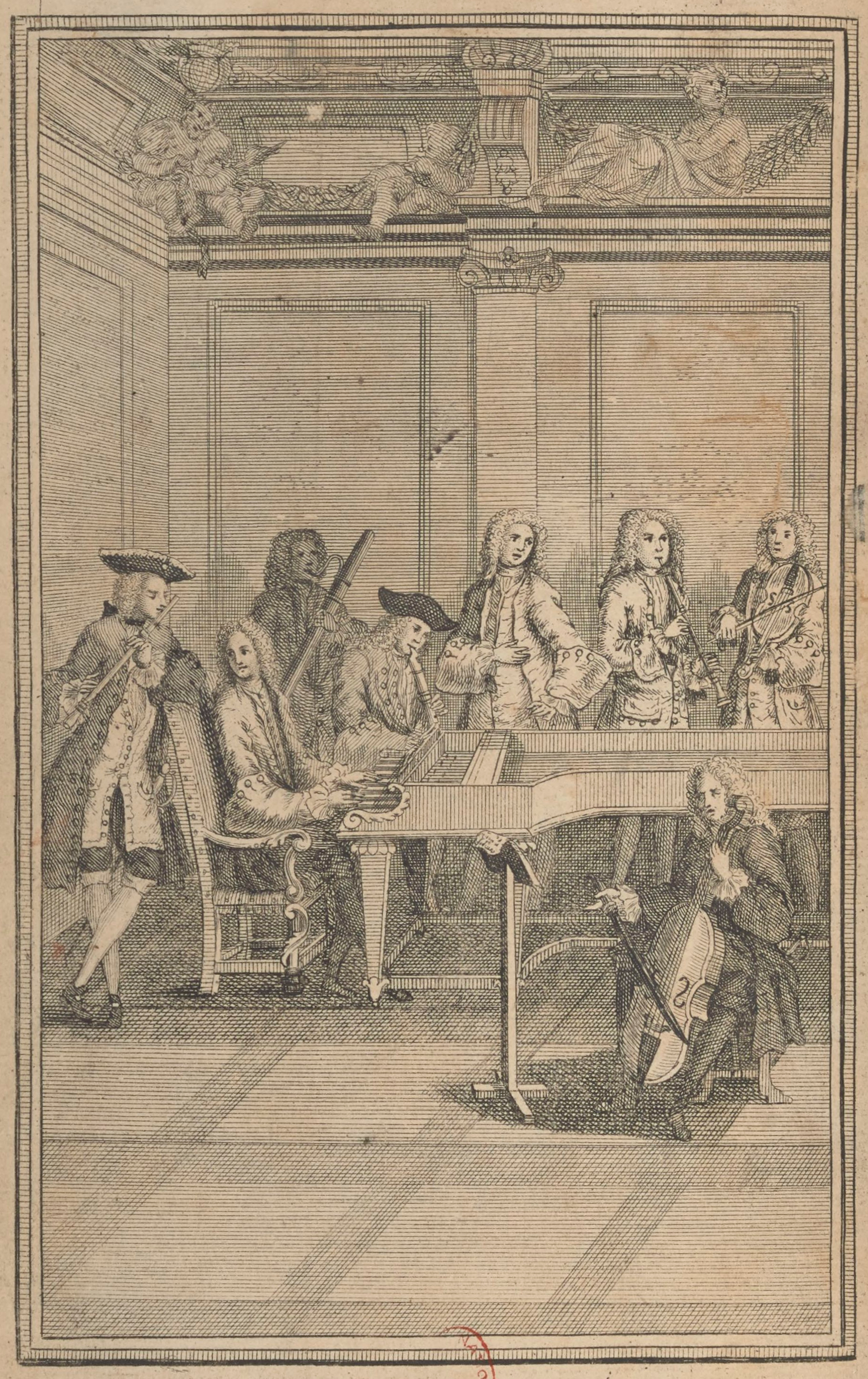 Fig. 1– Frontispiece from The Modern Musick-Master or The Universal Musician by Peter Prelleur, a manual on playing the recorder, violin and harpsichord. Engraving by J. Smith. [1]