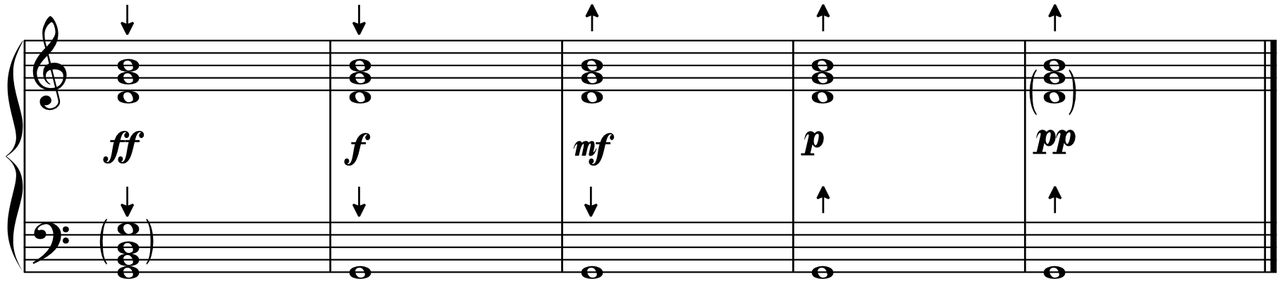 Fig. 2 – Graphic representation of the strategy followed by C. P. E. Bach when performing dynamics on a double manual harpsichord. The up and down arrows represent the upper and lower manuals, respectively. The parenthesis imply that any of the notes inside may be suppressed depending of register, dynamic effect, and/or voice leading. By the author.