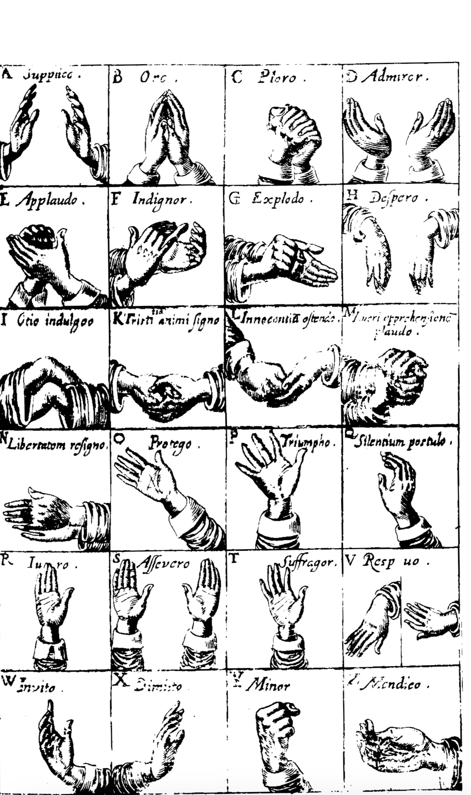 Fig. 3 – Chart of the different gestures discussed in Chirologia: or the Naturall Language of the Hand by John Bulwer (1644), p. 151. [73]