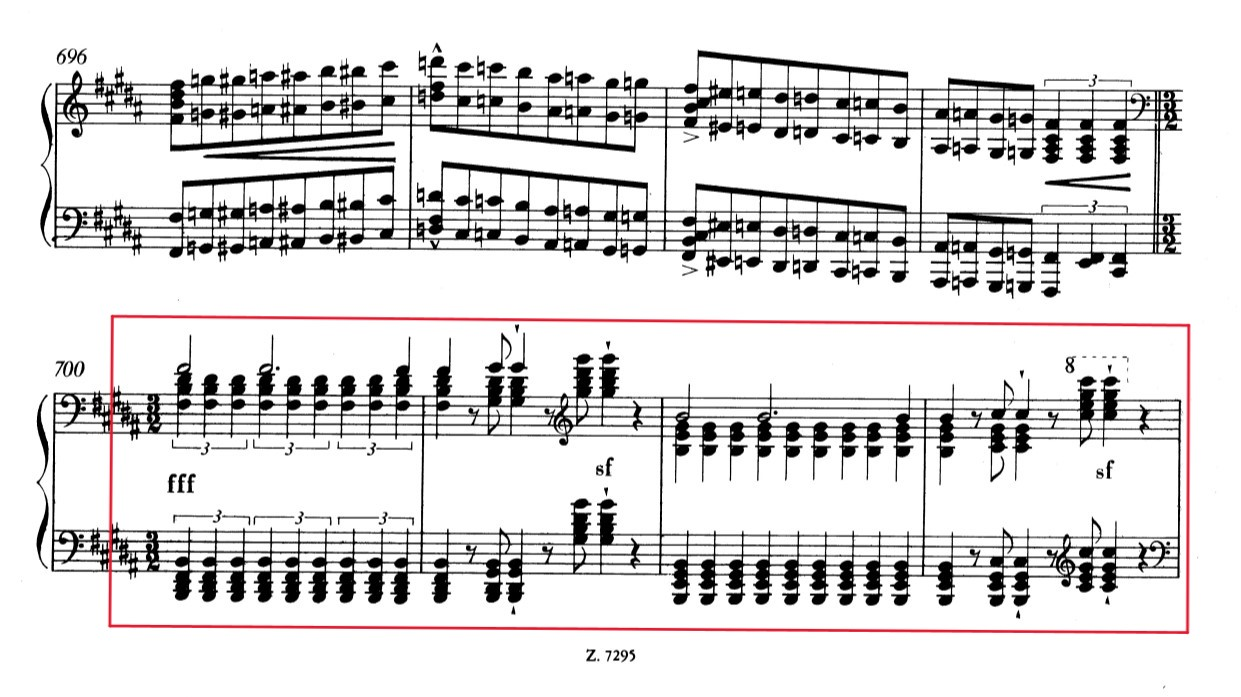 So, the Cross symbol is always used by Liszt to symbolize the Holy Cross and, for analogy, Christ and God, and he doesn’t make an exception for the Sonata. Liszt puts together two Cross symbols to create Christ’s theme. We find this theme used programmatically seven times in the Sonata (on the symbology on the number seven c.f.r. 4.2), and especially in three crucial points: once in the Grandioso section (bars 105 – 119), in which, together with the plagal Amen formula21, it symbolizes Christ and His promise of redemption; once during the Recitativo Appassionato section (bars 297 – 310, Example 5), in which it can refer to the Crucifixion and Christ Passion; and once in the Presto section (bars 700 – 710, Example 6), in which it can symbolize Christ at the Last Judgement during Armageddon. I will deepen this Christian interpretation in the next chapters (c.f.r. par. 4).