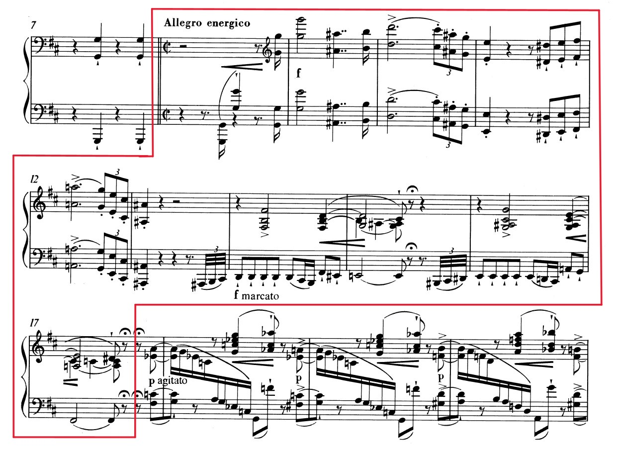 After the enigmatic introduction, there is the presentation of the first theme (bars 8 – 17, Example 2). The theme has an inner dual nature, and a high symbolic value: the first part (bars 8 – 13) symbolizes the fall of Lucifer7, and the second part (bars 13 – 17) symbolizes Satan,” The Adversary”8. The two symbols are always together throughout the whole piece9, “two sides of the same coin”.