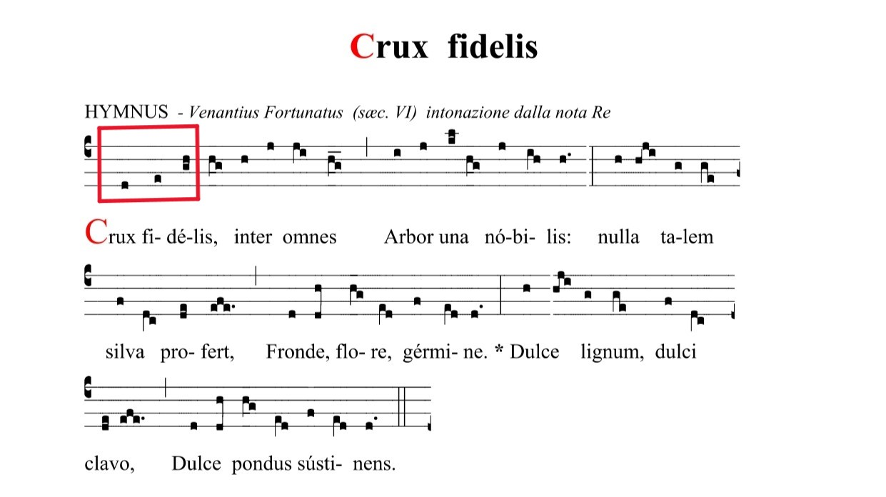 The Grandioso section (Example 4) brings one of the most important symbols of the Sonata and, in general, of Liszt’s music: the Cross symbol. It consists in a three-note figure made of a major second and a minor third. This symbol is taken from an old Gregorian hymn for the Good Friday: “Crux Fidelis” (Example 3). About this hymn, Tibor Szász says: “Crux Fidelis is the refrain of the hymn Pange lingua. […] In the Catholic liturgy as Liszt knew it, the hymn was central to the Solemn Adoration of the Holy Cross during the Good Friday Mass of the Presanctified. Ascribed to Venantius Fortunatus of the sixth century, the hymn celebrated the receipt of a relic of the True Cross brought to the monastery founded at Poitiers by Saint Radegonde.”17