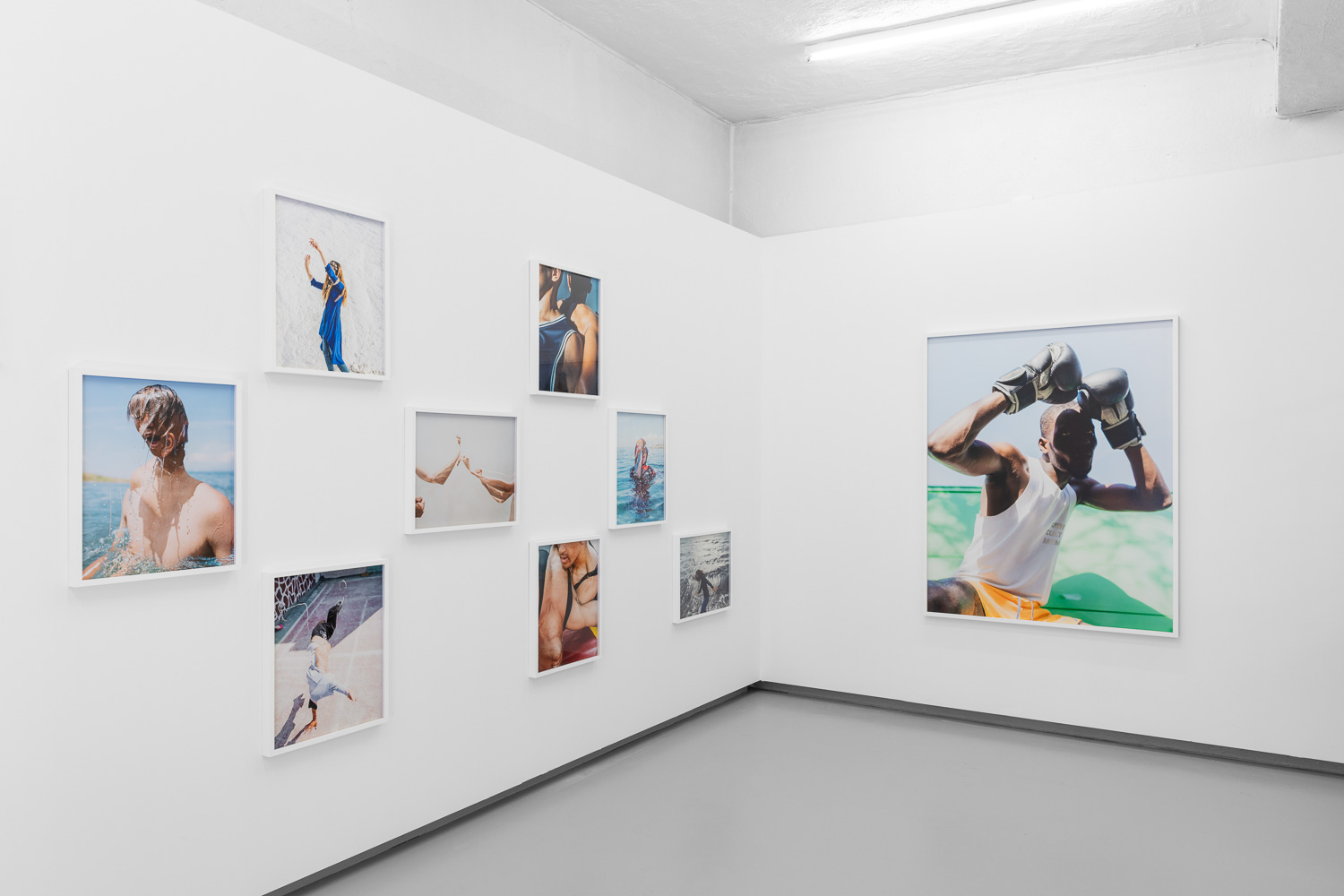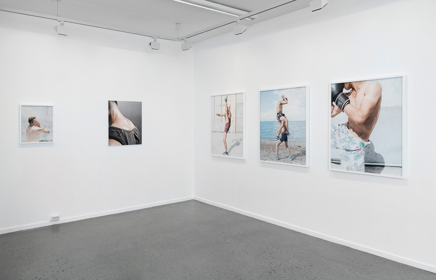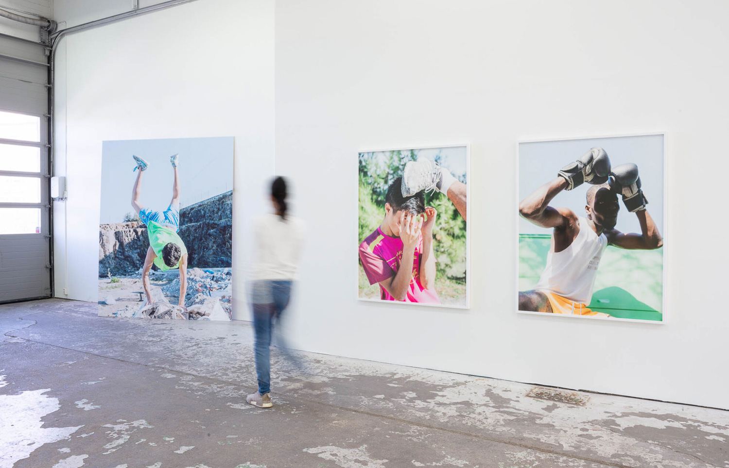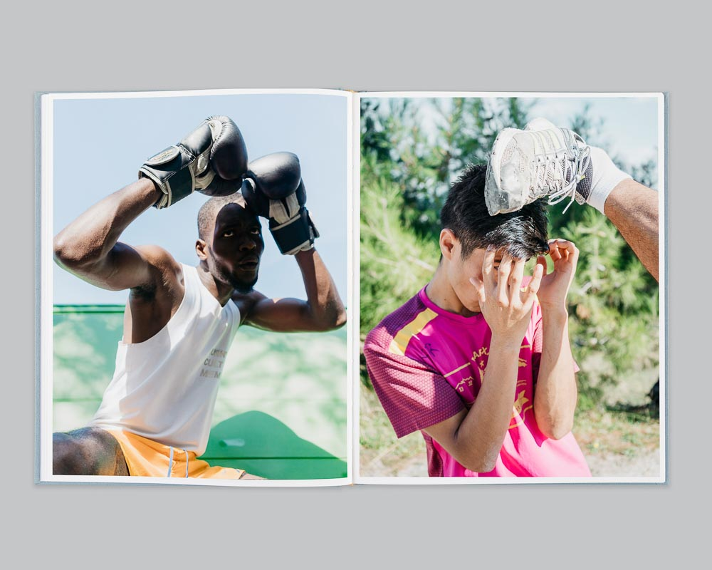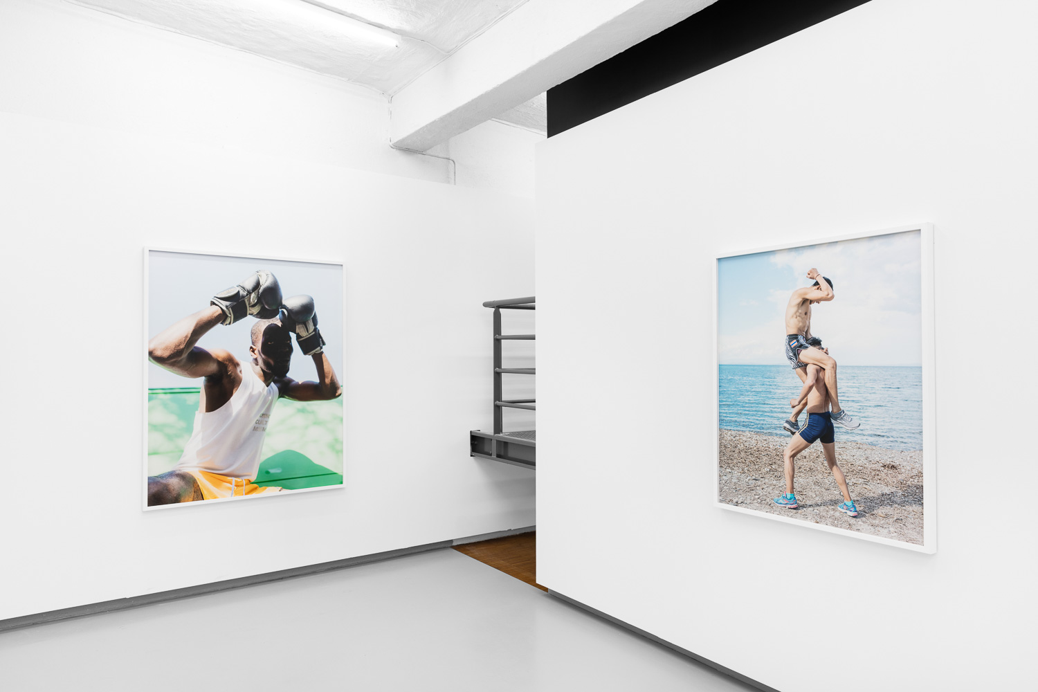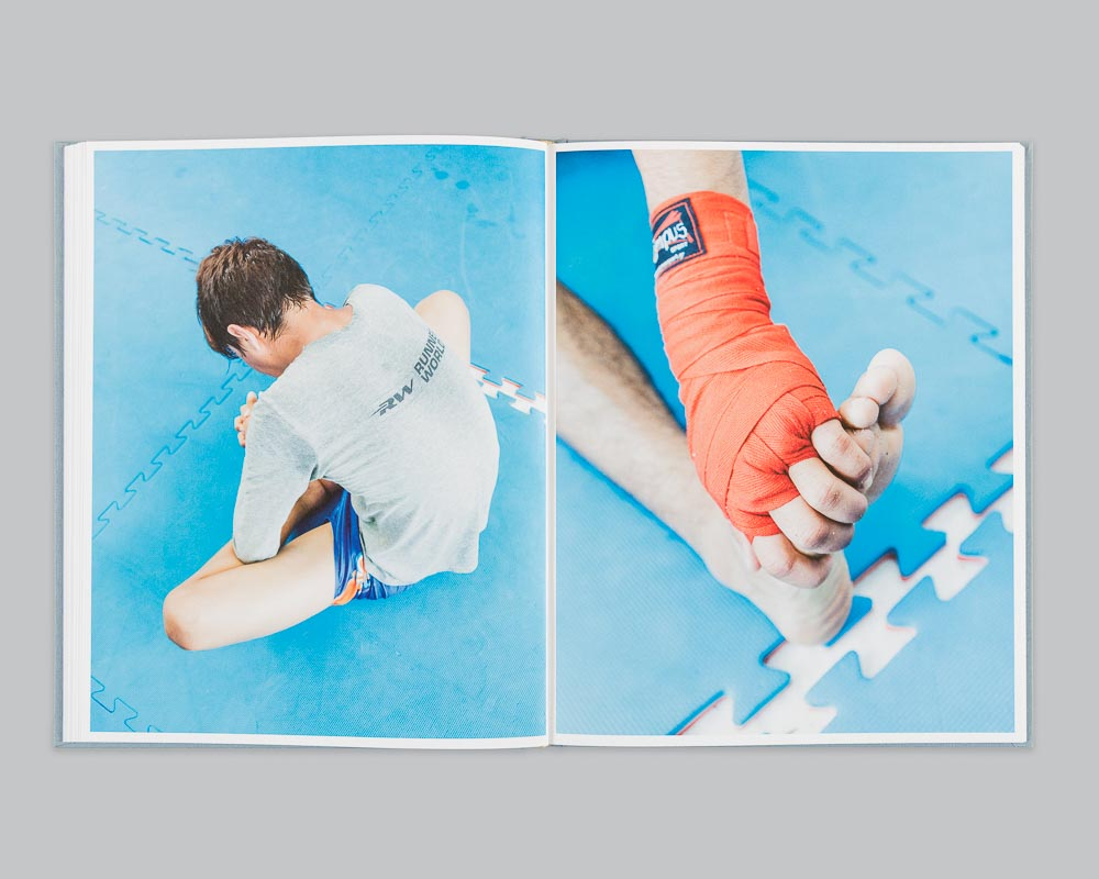 The bent and warped body parts that feature in several of the full-figure shots as well as closer images also associates to depictions of the human body frequently found in Surrealist photography, albeit in a muted register. One example is the series of close-ups of confusingly entwined, hands, legs and feet set off against the clear-blue wrestling mats. A similar interest in the contorted and twisted body can currently be found across the work of several other contemporary art photographers not working in a documentary mode. Some of these artists are Ingrid Eggen, Joanna Piotrowska, Viviane Sassen, Ingrid B. Olson, and Paul Mpagi Sepuya, who, all in their own distinct ways, use the warped human body as a site for explorations of issues such as sexuality, power dynamics, the estrangement of the human body in an increasingly automated society, or as an entryway to explore the margins of the socialized body, where muscle reflexes and more instinctive forces play out.