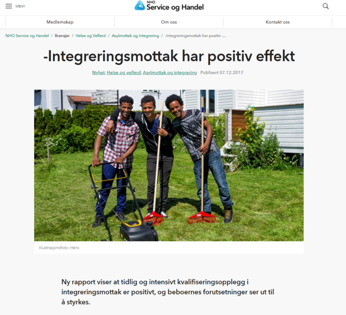 Media coverage of the evaluation of reception centres; for the original report in Norwegian, see Gram and others (2019). The front cover here is not the report Jon was part of, but an illustration chosen by a business organisation (NHO) news page. Observe how the news site chose to illustrate work-life integration through former refugees mowing a lawn.