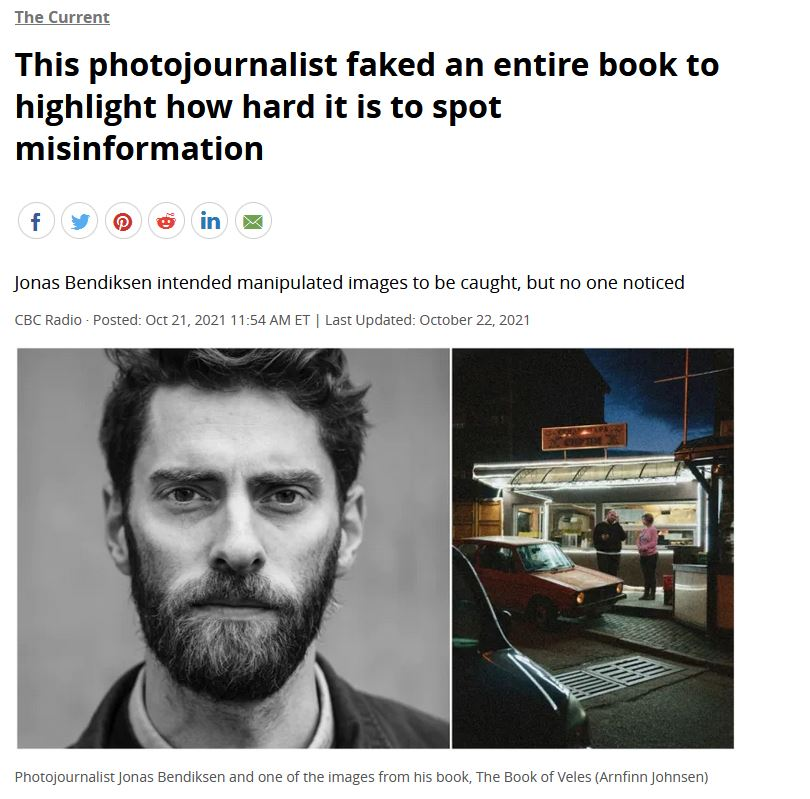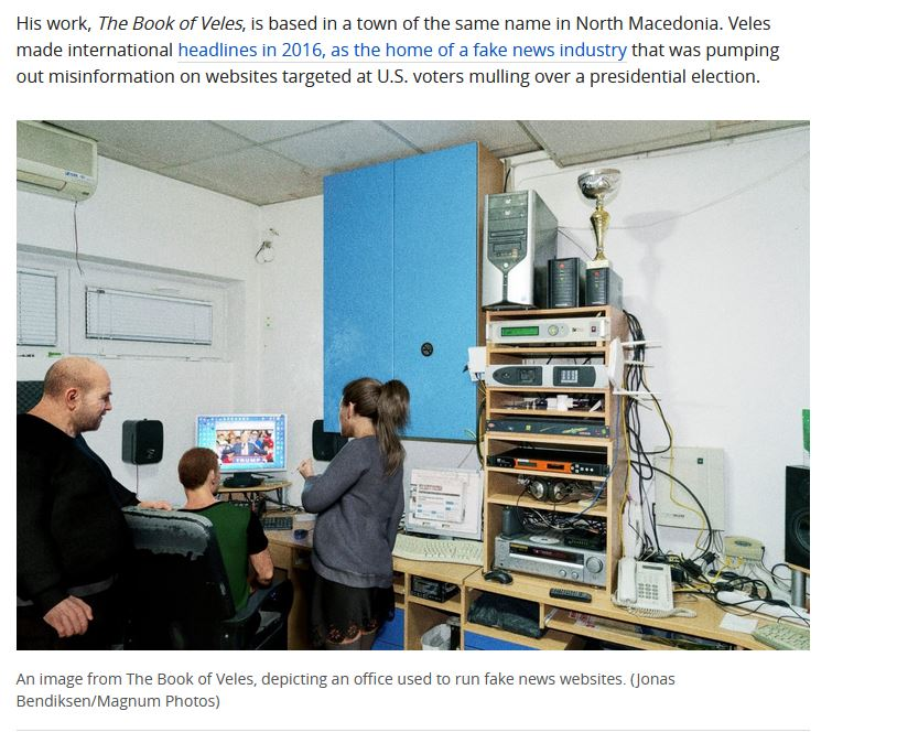 Screenshots from CBC (Canadian Broadcasting Corporation) coverage of Bendiksen’s book The Book of Veles. The book was published as a documentary on ‘troll factories’ (where fake news stories are produced and distributed on social media) in Northern Macedonia. Only after six months and much publicity did he announce that the images were crude manipulations made at home, and the project was to see whether this was noticed. He said in interviews that he wanted to show how we do not notice.