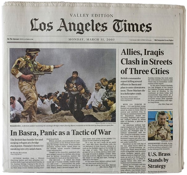 The front page of the LA Times, 31 March 2003, with the faked image by Brian Walski. Originally, in the first picture, the soldier motioned with his hand, while in the second, the man with the child looked at the soldier; the combined image shows a stronger interaction between the two than in the original. The join is easy to see if one looks at the man in white in the left corner, whose back reappears to the right of the soldier’s leg.
