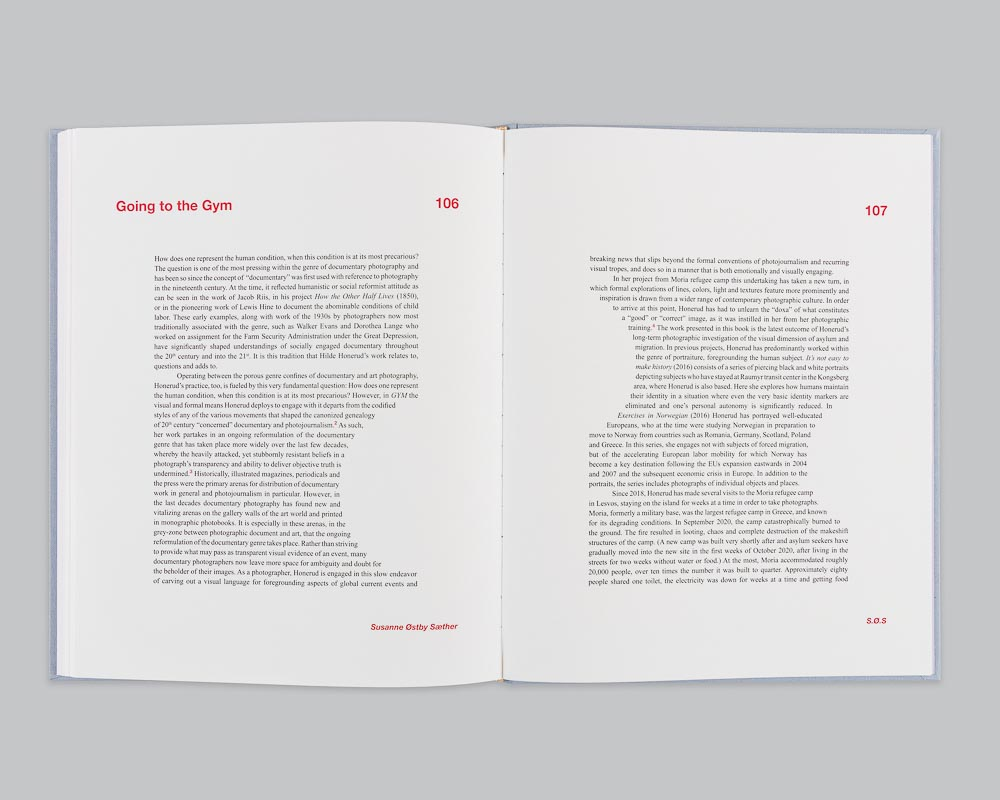 ’Operating between the porous genre confines of documentary and art photography, Honerud’s practice, too, is fuelled by this very fundamental question: How does one represent the human condition, when this condition is at its most precarious? However, in GYM the visual and formal means Honerud deploys to engage with it departs from the codified styles of any of the various movements that shaped the canonized genealogy of 20th century ‘concerned’ documentary and photojournalism. As such, her work partakes in an ongoing reformulation of the documentary genre that has taken place more widely over the last few decades, whereby the heavily attacked, yet stubbornly resistant beliefs in a photograph’s transparency and ability to deliver objective truth is undermined’. (Sæther 2021: 106)