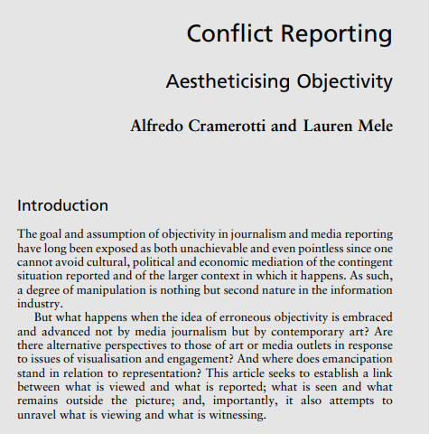 [The project] explores visual content of news reports from the hypothesis that news images are increasingly being emptied of content as reporters search for ways to communicate presence and authenticity.
