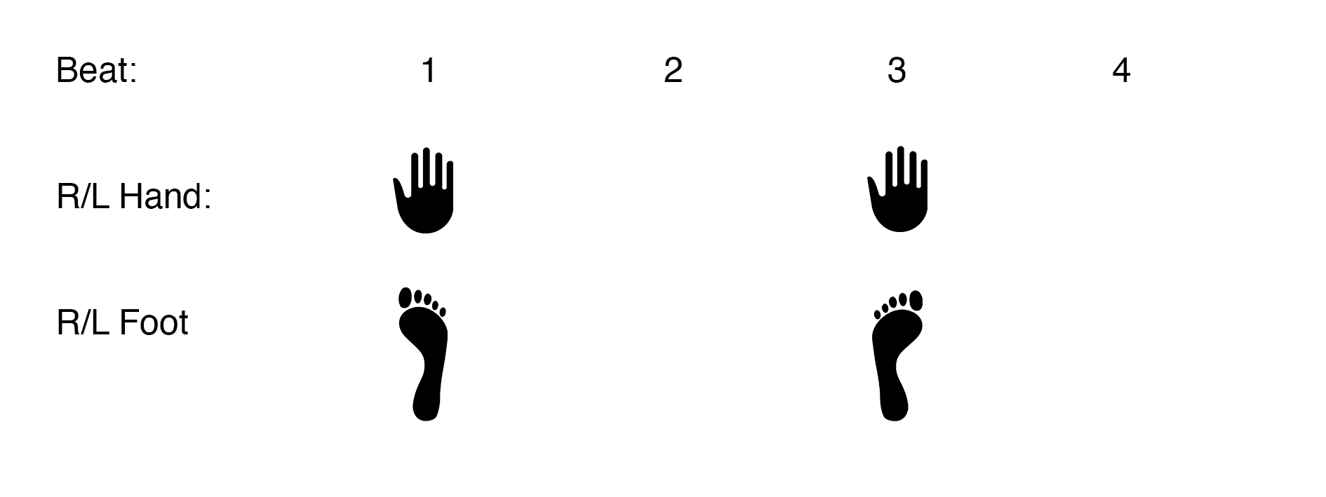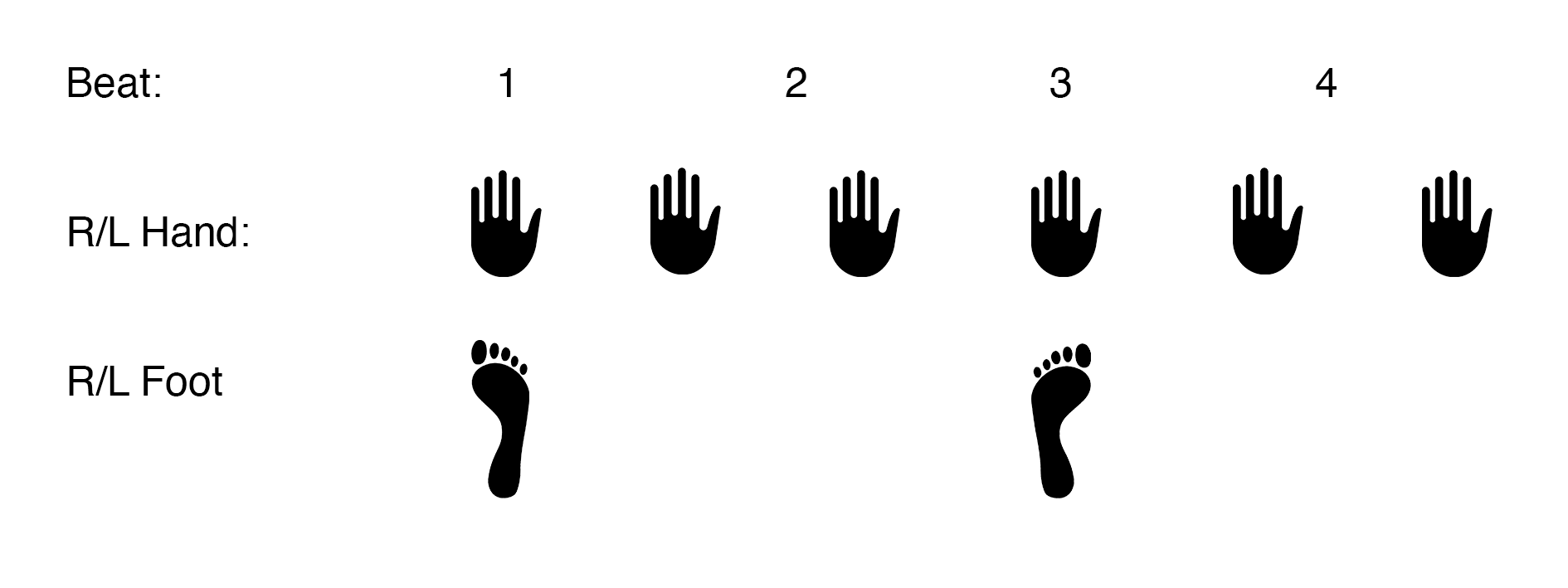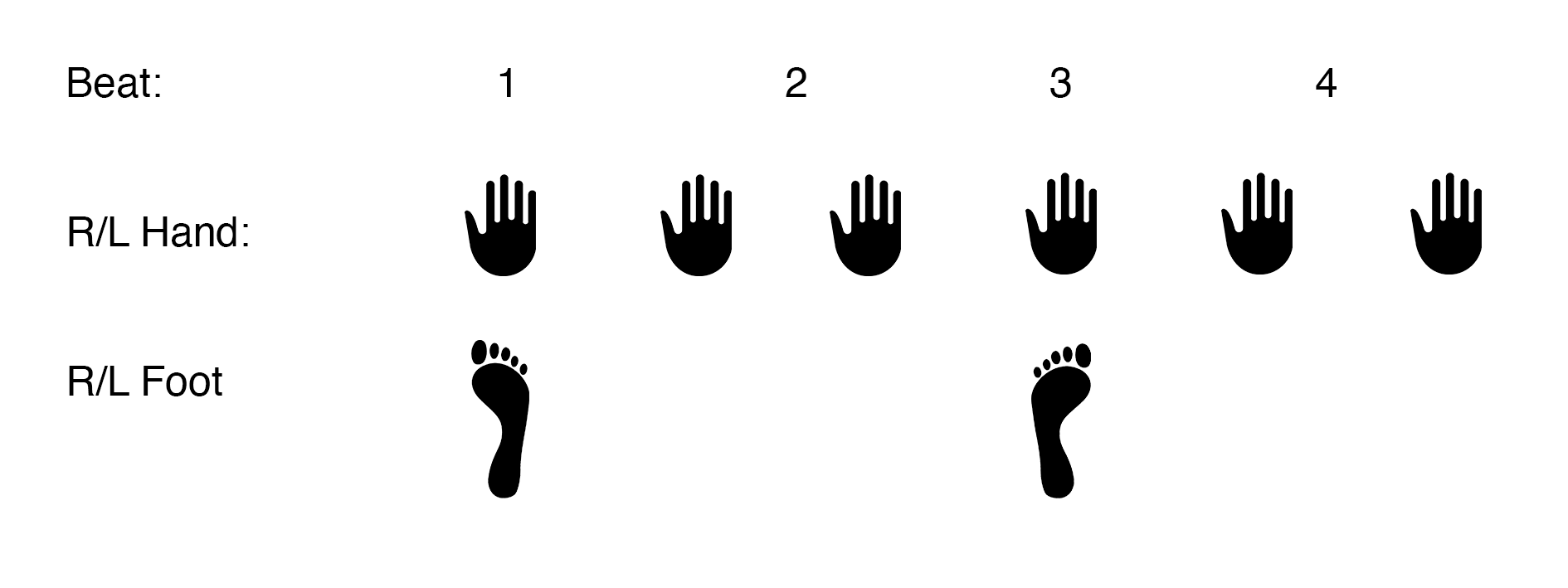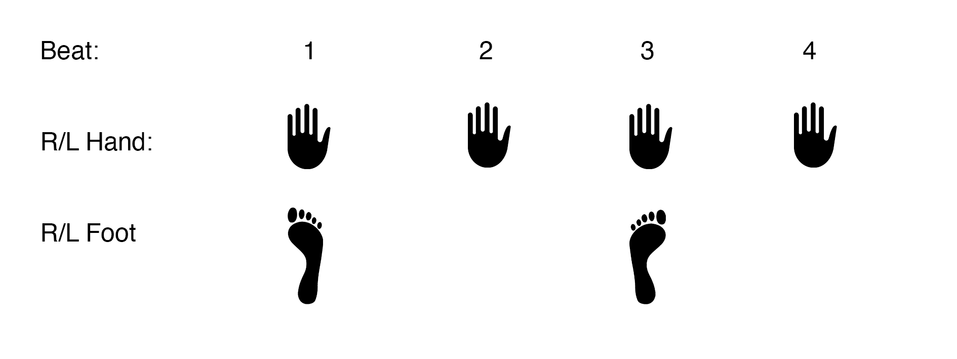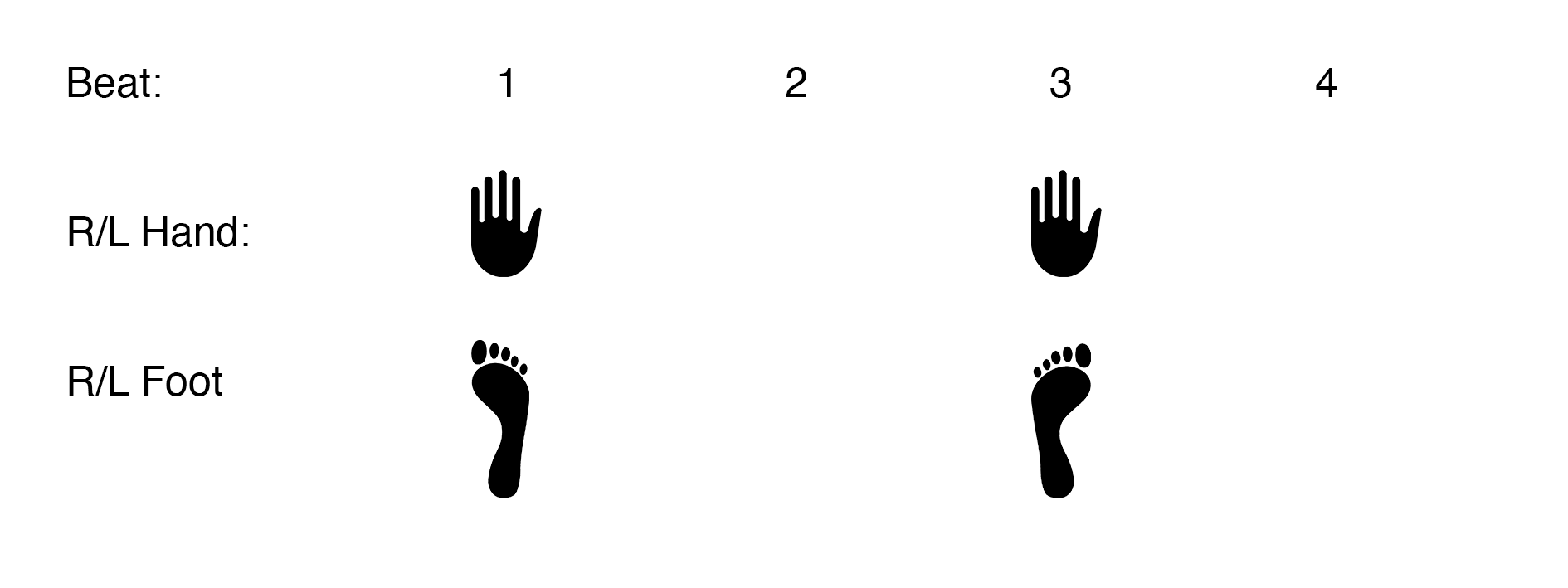 By observing random people reacting to music in the most spontaneous, subconscious manner (at a Glastonbury festival, at the New Year’s concert from Vienna, and selected performances from North Sea Jazz Festival), we determined that the simplest exercise and the starting point for our rhythmic exercises should be clapping hands (in 4/4 on the 1st and the 3rd or the 2nd and the 4th beat) and stomping feet (on the 1st and the 3rd beat).