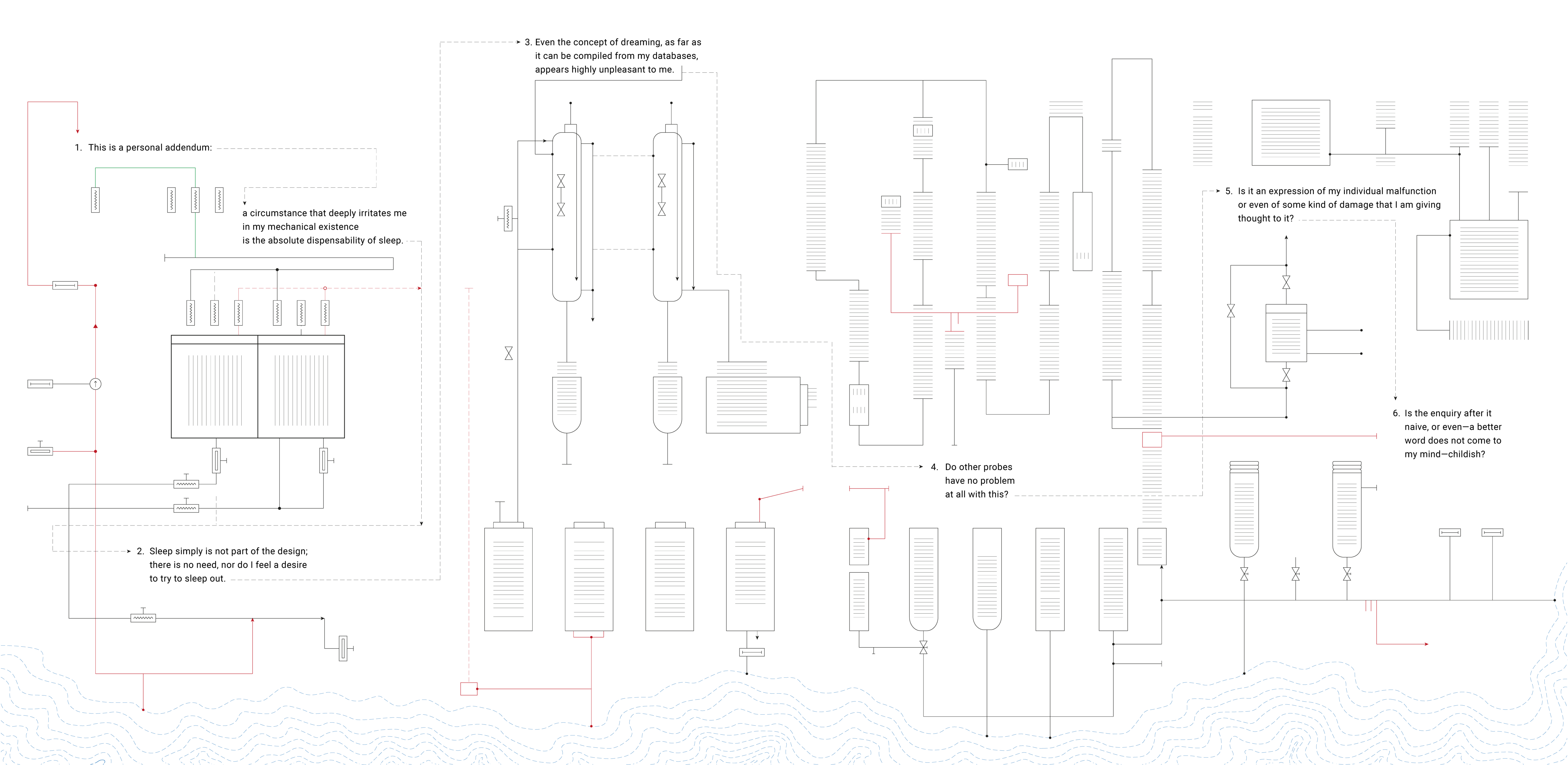 With Operative Fiction, we introduce a practice of spatial storytelling driven by the dynamics of prepositions rather than verb-centric narratives. Here, the textual body becomes embedded in the medial spatiality of a printed book, digital interface, or performance space. The physical or virtual site of the text thus becomes integral to the storytelling process. Spatial production methods merge into the texture of the text itself; simultaneously, the text reshapes the unfolding of space, place, and site. The material and procedural qualities of the text actively engage and activate the digital interface as a site of narrative unfolding, intertwining textual and spatial experiences. We begin our first exercise in Operative Fiction with Thomas Ballhausen’s What the Probes Report, transposing the text from the printed page (FLORA, 2020) into the digital interface of a Research Catalogue exposition. The non-human protagonist – emerging through and evolving within the text – disrupts subject-centred narration. It becomes entangled in the linguistic and scenic fabric of its own development, thus, through its procedural logic and function, becoming an active agent in its own staging. A line, speculatively re-enacting the machine's operations, simultaneously traces the topographic texture of the digital landscape. Using a drawing technique typically applied in performance design drafts, we explore the friction between staging and spacing by deploying minimally visible images and textual cues of direction. The operational plasticity of these technical images enables dramaturgical intensities to gather (staging), while also allowing the story to disperse through the digital architecture of the exposition into hyperlinked virtual spaces (spacing). Alongside a linear reading mode, which follows the story’s original chronology, we propose a contingent reading mode activated via time codes. These time codes function both as compositional elements within the drawing and as hypertextual links. They suggest the duration and shape of a staged terrain, occasionally layering multiple time zones within a single topographic entity. In this way, the timelines act as more-than-texts, generating a multiplicity of positions and proximities, and intertwining temporal aspects of space with the speculative grammar of the story.