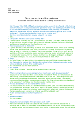 You stand. You watch. Then your thoughts dissolve. You can now only see the periphery, not knowing when that happened. You don’t care about that. Actually you don’t care about much. You are blank, content, suspending time through boredom. Your jaw is the first to go. As it gives up you can feel the muscles very slowly disappear from the rest of the face. It takes with it the shoulders, but the rest of the face stays put. Only when it has reached the saturation point of curve in the whole of your back will the face follow the insisting neck. The knees starts bending but you hardly notice. The saliva that has gathered in your mouth is now giving in to gravity and pours down on the floor in slow drips. You see the puddle and know you will end up in it. «That’s life», you think. The thigh is beginning to take over the weight of your held, heavy, excruciatingly slow, curled up figure and your feet is giving space for the body to enter in between them. After an eternity your shoulders reach the floor and your bum the heels, and you can start to let go of the hold. Slowly you sink even further, into and through the floor underneath, your jaw still in the same open position. As melting meat your weight pushes the boarders of your body further and further away from each other. You are wide and lumpy. It’s over.