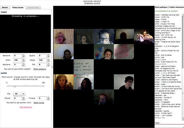 The final performance interface, developed in 2009 by Estelle Senay of x-réseau / Théâtre Paris- La Villette, unites several performers, each in his/her own environment while executing a performance protocol in front of a webcam, in one single video projection. From their isolated positions, scattered in space, these performers share a place of expression and responsibility, a playground, a laboratory.