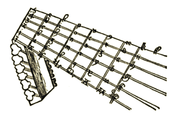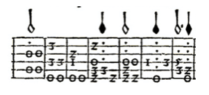 - German tablature: Unlike all previous aforementioned systems, the German tablature does not use six lines for the orientation on the courses, but every single position on the lute has its own symbol, as we can see in the diagram below by Sebastian Virdung. If more than one symbol appears underneath, the following group of notes are played together. This system was considered standard especially in German-speaking countries during the 16th century.32