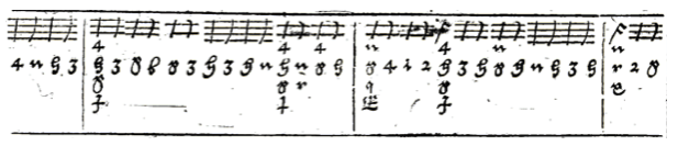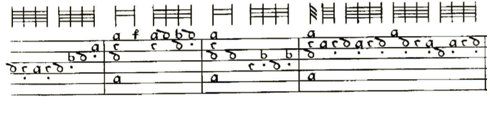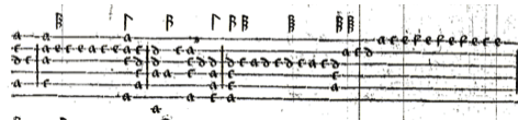 - Italian tablature: a numerical system of tablature (open string is represented by O, first fret represented by 1, etc), the six lines represent the six courses of the instrument, where the first line corresponds to the lowest course. Rhythmic indications can be found above the lines. In most cases, the rhythmic indication is not repeated with every beat, but lasts until the next note length changes. This system will be used as the main system throughout this thesis, as it is the most common system within the majority of vihuela repertoire.