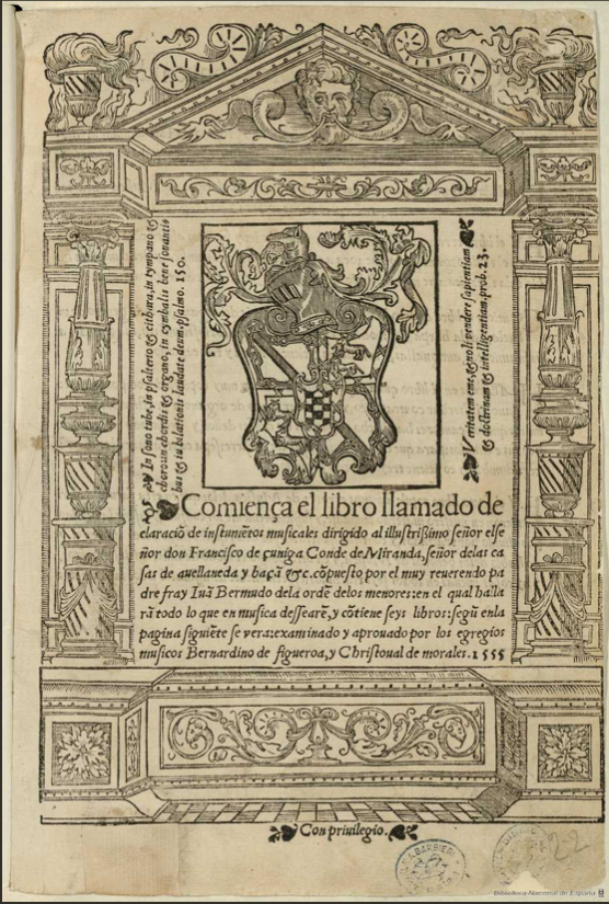Bermudo was born to a wealthy family in Éjica, a city of the Andalusian province in Spain. Although he had studied music in his youth, Bermudo was mostly self-taught. At the age of 15 he entered the Order of Franciscan Friars (Menores de la Observancia). This did not encourage the study of music, because of the required vow to a life of poverty, preaching and penance.34 Later he continued his mathematic studies at the University of Alcalá de Henares. During the quadragesimal (forty days of the fast of Lent) in 1549, Bermudo preached in the convent of Santa Clara in Montilla. This was also the time when he was introduced to Cristóbal de Morales.35 Bermudo left a variety of records describing interesting relations with illustrious personages of this time in dedicatory epistles in his books. The importance and recognition of Bermudo is illustrated, for instance, with the laudatory letter by Cristóbal de Morales in book V of the Declaración de los instrumentos musicales (1555). According musicologist Robert Stevenson, this is the only remaining letter recommending a musical treatise written by this eminent composer.36