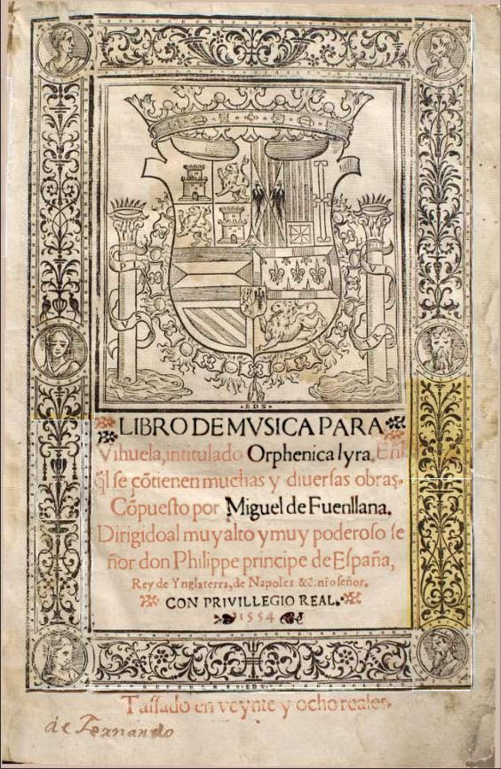 Miguel de Fuenllana (ca. 1525 - 1585/1605) is considered to be one of the most important vihuelists who published books during the 16th century in Spain. The well known author of Libro de música para vihuela, intitulado Orphénica Lyra was born in the Spanish city of Navalcarnero around the year 1525. Unfortunately, he was blind since then,51 as we can deduce from remarks in the preface of Orphénica Lyra, in which he speaks of God having deprived him of “corporeal light” from his infancy and, in the Prologue to the Reader, of work in “corporeal darkness”.52 More recently found documents confirm that he was blind from birth. He was unable to sign his name to documents. Klaus Wagner was the first to publish these documents in his book on Martín de Montesdoca. Fuenllana spent a significant part of his life in the service of the Spanish royal family. This position was definitely important for his musical development and reputation. There is no evidence suggesting Fuenllana was ever employed by King Philip II. Despite the uncertainty of their relationship, Fuenllana dedicated his Orphénica Lyra to King Phillip II. It is important to mention that this vihuela book was written before Fuenllana’s service in the royal family. Therefore, Orphénica Lyra is more reflective of the musical situation in Sevilla and the house of the Marquesa de Tarifa and her husband, the Duque de Alcalá Pedro Afán de Ribera, where he was employed. Fuenllana's name is mentioned in Bermudo’s Declaración (1555), where he is described as being in the service of this important noble family.53 One of the most precise documented indications of Miguel Fuenllana's career is from the 11th of August in 1553, when he received permission from Philip II to print his vihuela book.54 The print of Orphénica Lyra was possible given the substantial financial support of Fuenllana’s father-in-law Juan de Salazar, a famous Sevillian doctor.