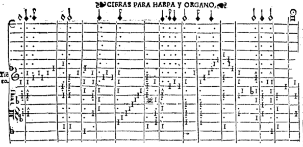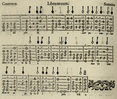 Alonso Mudarra (1505/1510 - 1580) was associated mainly with two cities: Guadalajara and Sevilla, where he spent the majority of his life. The greater part of the information we have nowadays comes from the research of Emilio Pujol and is published in his Tres libros de música de cifras in 1984. Pujol assumes Mudarra’s year of birth according the publishing date of his collection for vihuela, or according the year of Mudarra’s ordination to the priest. He presumably spent his childhood in Guadalajara in Palacio del Infanado, where he was in the service of the Dukes of Infanado for several years (Diego Hurtado de Mendoza and Iñiga López de Mendoza). As Guadalajara was an important cultural center, it is almost certain that he studied theology and philosophy and likely also received his musical training there.70 It can be also assumed that Mudarra took part in the expedition accompanying King Charles I. to Bologna in 1530 with the Duke Iñigo López de Mendoza in 1530. The King was accompanied by many subjects including several prominent musicians.71 In 1546, Mudarra was ordained as a priest in Seville Cathedral, where he worked until the end of his days.72 Mudarra’s main work is his collection Tres libros de música de cifras from 1564 containing compositions for vihuela de mano, renaissance four course guitar and voice with accompaniment. Mudarra also introduced a system of tablature for a harp or organ, however, compositions for those instruments do not appear in the collection.73