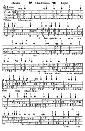 Enríquez de Valderrábano belongs to a group of authors about whose lives we have almost no information. There are several hypotheses about his place of birth. Some sources describe his birthplace as Peñaranda del Duero, according the note in Valderrábano’s vihuela book. Here it is mentioned just as vecino (the modern translation would be a neighbour and other possible translation would be taxpayer). Another possibility might be the city Valderrábano de Valdavía, however, the only indicator is the frequency of the surname Valderrábano in this area.74 The only evidence found is the year 1547, when his collection for vihuela Libro de la música de Vihuela intitulado Silva de Sirenas was published in Valladolid. This anthology is dedicated to Francisco de Zuñiga, the Count of Miranda. It has been recently confirmed that Valderrábano was in his service.75 The Silva de sirenas is quite extensive. After the prologue containing detailed information especially about playing from tablature, follow six books divided by the context. Besides fantasías composed by Valderrábano himself we can find within the books a significant number of intabulations of vocal pieces by authors such as Josquin Despréz, Nicolas Gombert, Fernando Layola, Cristóbal de Morales, Vincenzo Ruffo, Jean Mouton and others. Valderrábano thus demonstrates his extensive knowledge of the contemporary production of European vocal works.76