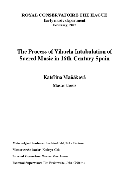 The process of vihuela intabulation of sacred music by Cristóbal de Morales, using examples contained in Orphénica Lyra by Miguel de Fuenllana and instructions by Juan de Bermudo.