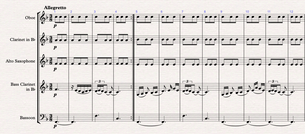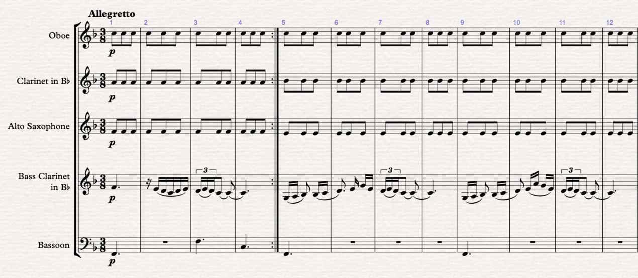 Figure 2 (m.1-12): Section A - 1st theme in F major. Melody in the bass clarinet, harmony in the oboe, clarinet and saxophone and bass in the bassoon. In this version I filled in the bass line.