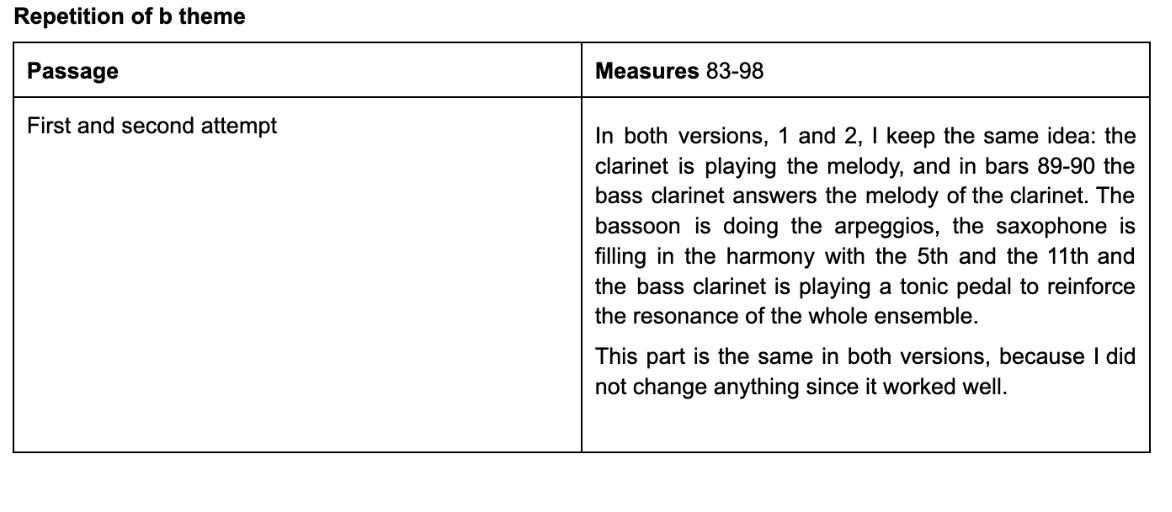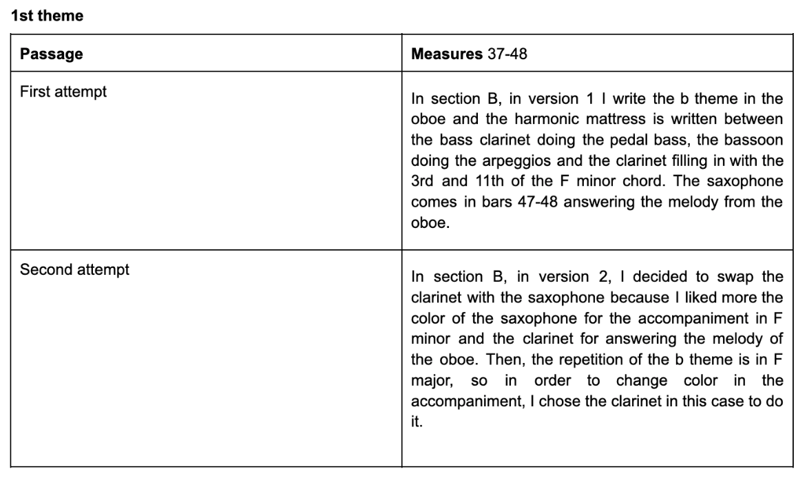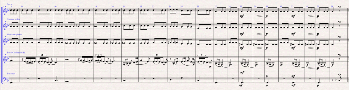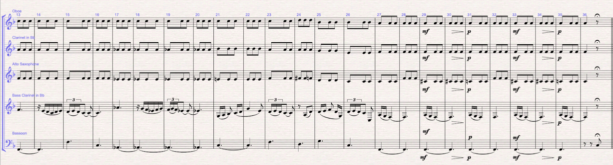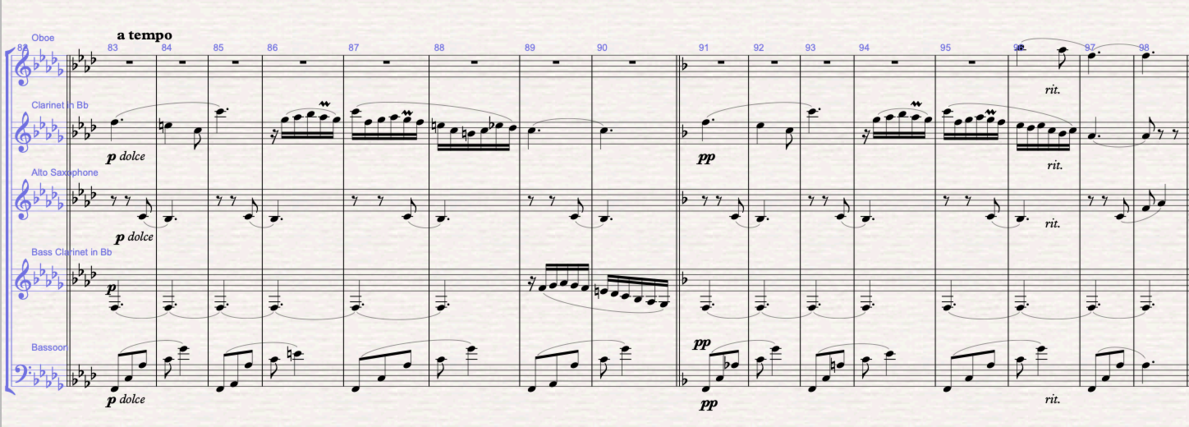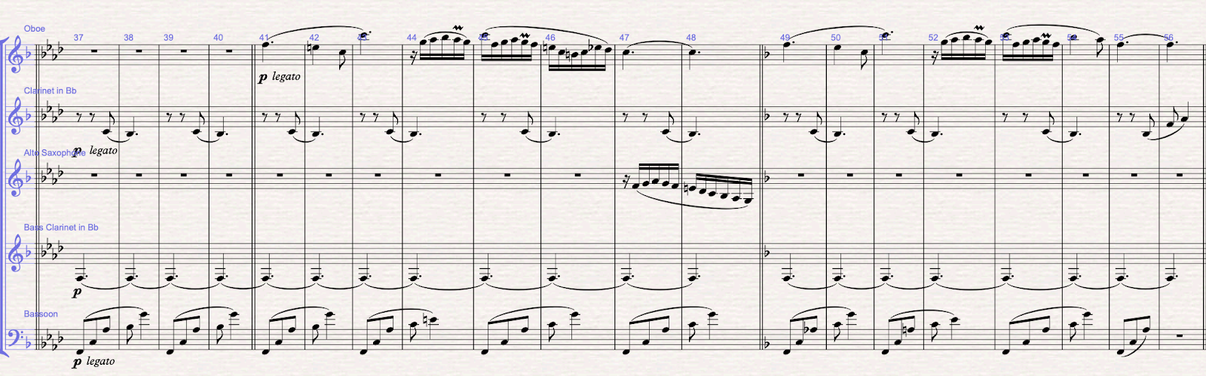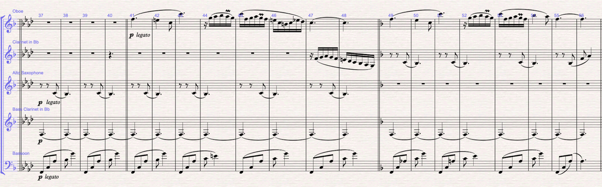 Figure 6 (m.37-48): Section B: the b theme is written in F minor. The melody is written in the oboe, and the harmonic mattress is written between the bass clarinet doing the pedal bass, the bassoon doing the arpeggios and the saxophone filling in with the 3rd and 11th of the f minor chord. From bar 42, the F minor chord becomes a Faug7 with the 9th. In bars 47-48 I write the answer to the melody in the clarinet. In bars 49-51 modulates to F major, and the clarinet takes over the accompaniment from the saxophone.