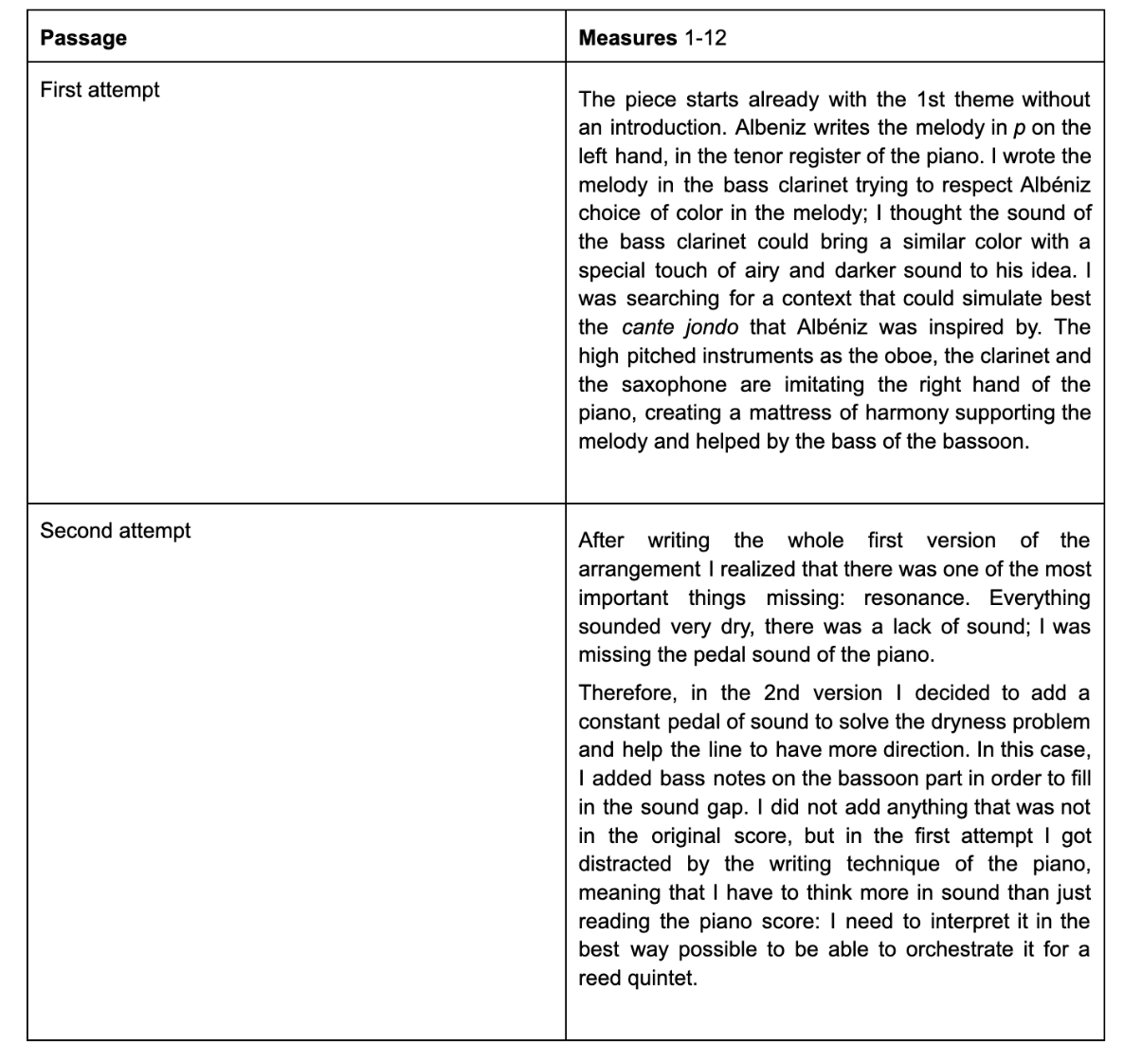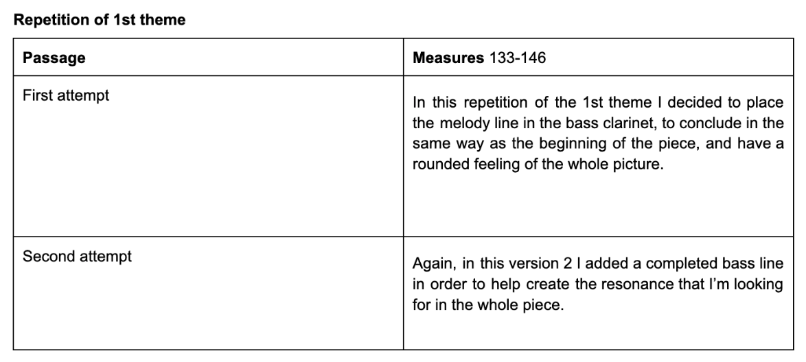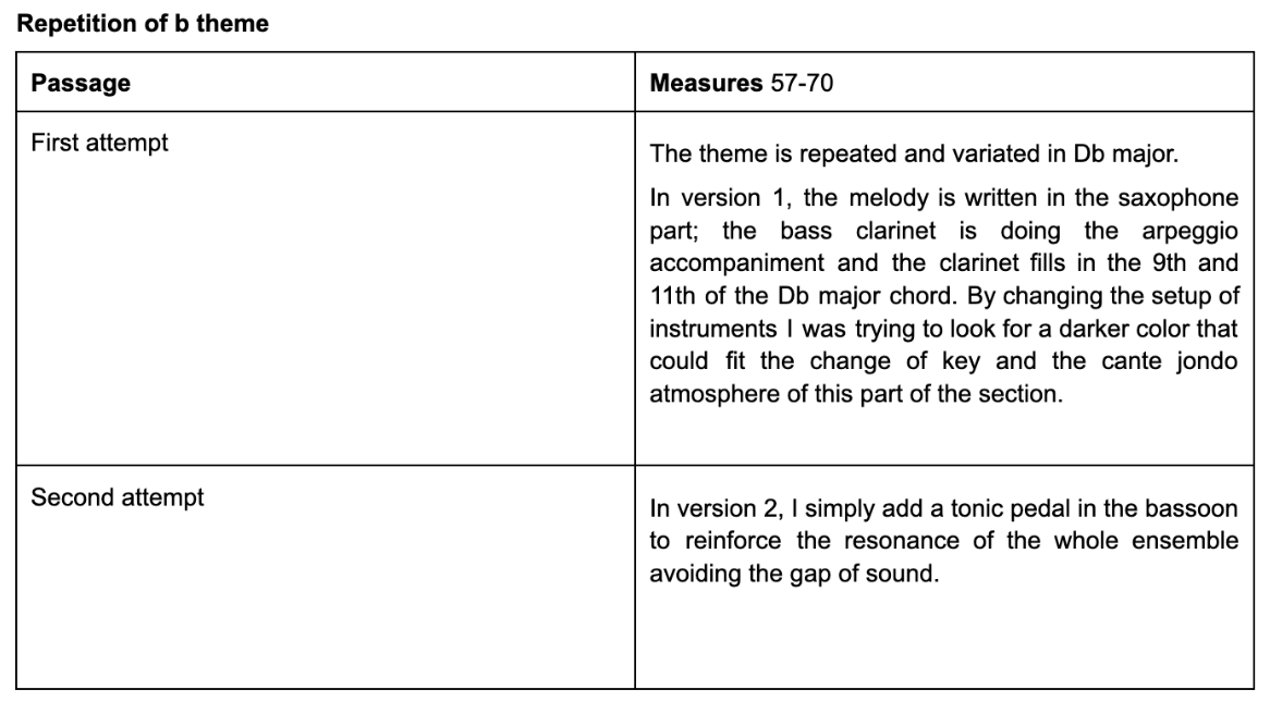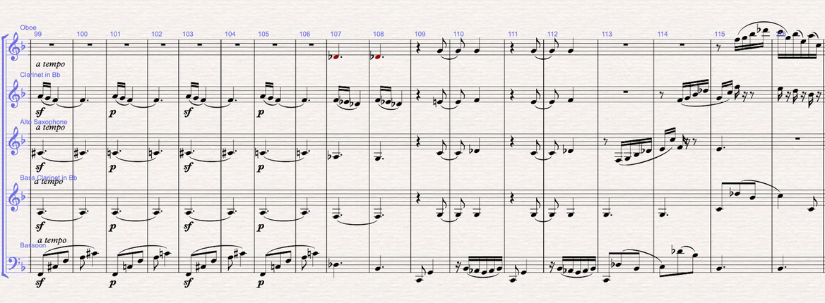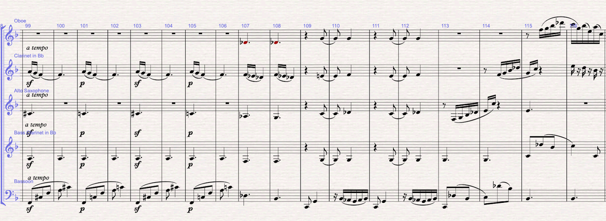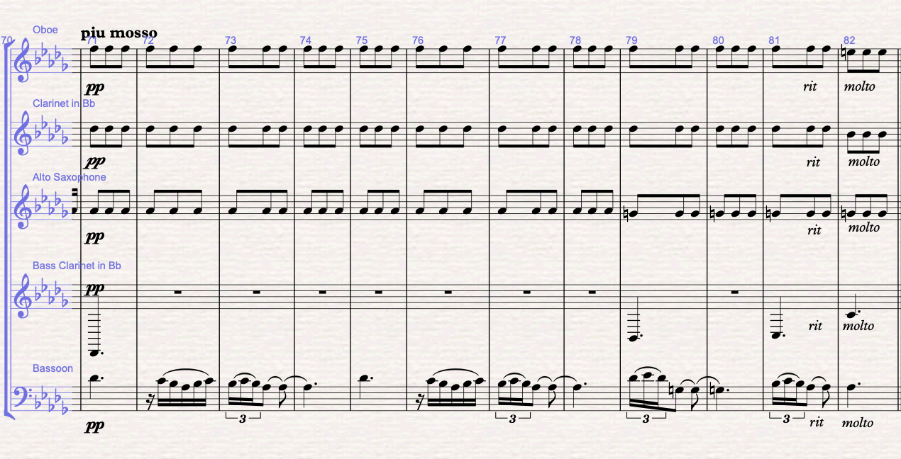 Figure 6 (m.37-48): Section B: the b theme is written in F minor. The melody is written in the oboe, and the harmonic mattress is written between the bass clarinet doing the pedal bass, the bassoon doing the arpeggios and the saxophone filling in with the 3rd and 11th of the f minor chord. From bar 42, the F minor chord becomes a Faug7 with the 9th. In bars 47-48 I write the answer to the melody in the clarinet. In bars 49-51 modulates to F major, and the clarinet takes over the accompaniment from the saxophone.