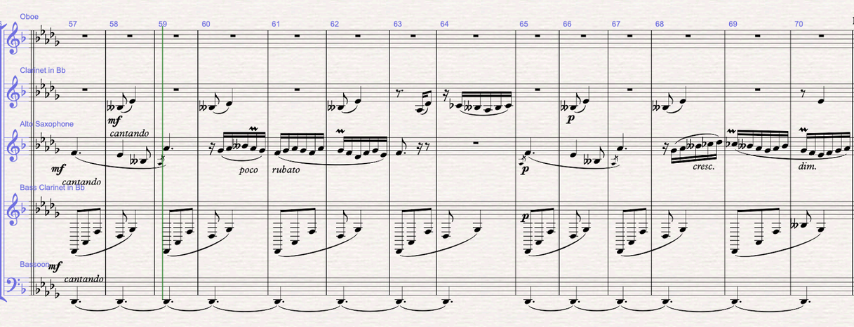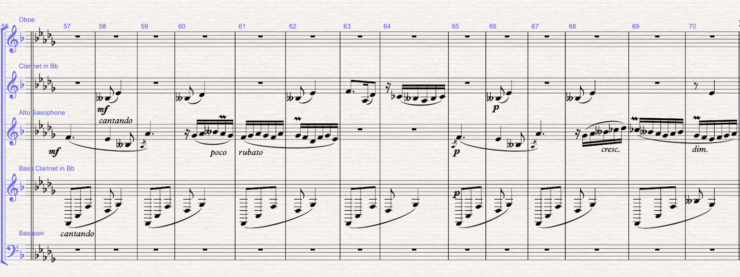 Figure 7 (m.57-70): Direct modulation to Db major. The melody is now written in the saxophone part, the bass clarinet is doing the arpeggio accompaniment and the clarinet fills in the 9th and 11th of the Db major chord.