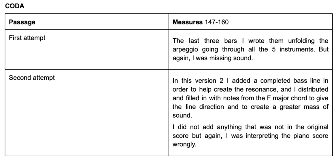 Figure 19 (m.147-160): CODA section. There’s again the series of tension and release of Faug5 - F major, combined with the change of dynamics. The last 3 bars are just the F major chord in the form of arpeggio. Again, in version 2 I added a completed bass line in order to help create the resonance, and I distributed and filled in with notes from the F major chord to give the line direction and to create a greater mass of sound.