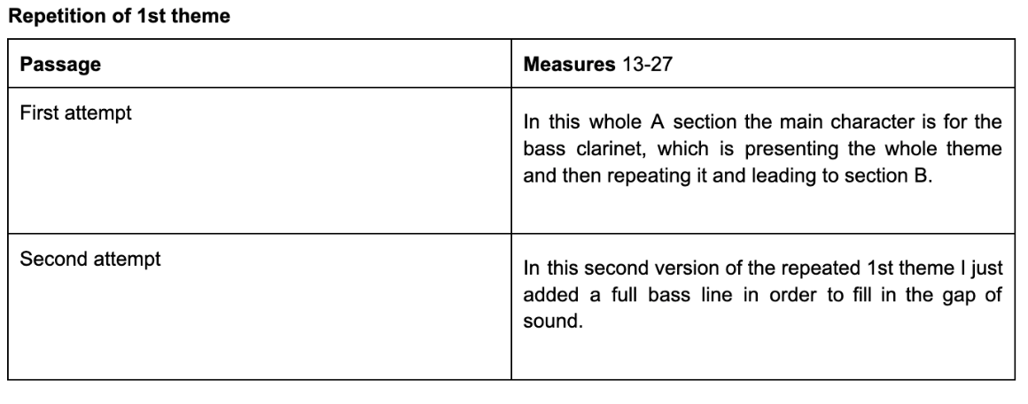 Figure 4 (m.13-27): Section A: repetition and development of the 1st theme. The theme is repeated again in F major and right after in Ab major, but in m.21 comes back again to F major and closes the phrase with a perfect cadence (V-I), leading to the closure of the section. This version is the same as the first one besides that I keep filling in the bass line of the bassoon.