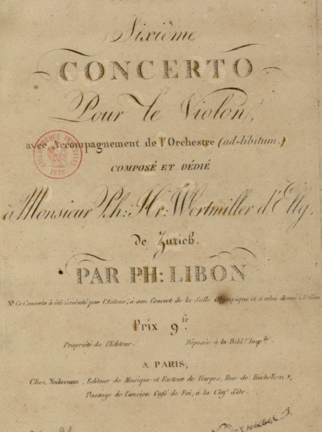 I found out that the Concerto No. 1 was located in the Bibliothèque Nationale de France; No.4 in the Österreichischen Nationalbibliothek, and No.5 in the Bibliothèque du Conservatoire Royal de Liège. I decided I was interested in the later concerts rather than the early ones, so I tried to obtain digital copies of these last two. The copy I received from Liège comprised all the orchestra parts but unfortunately, it was missing the central violin part. The scores sent by the ONB, of Concerto No.5, happily were completed. However, reviewing the music, I ultimately opted for his Concerto number 6, as it appeared to embody better the canon of heroic concerto modelled after Viotti.