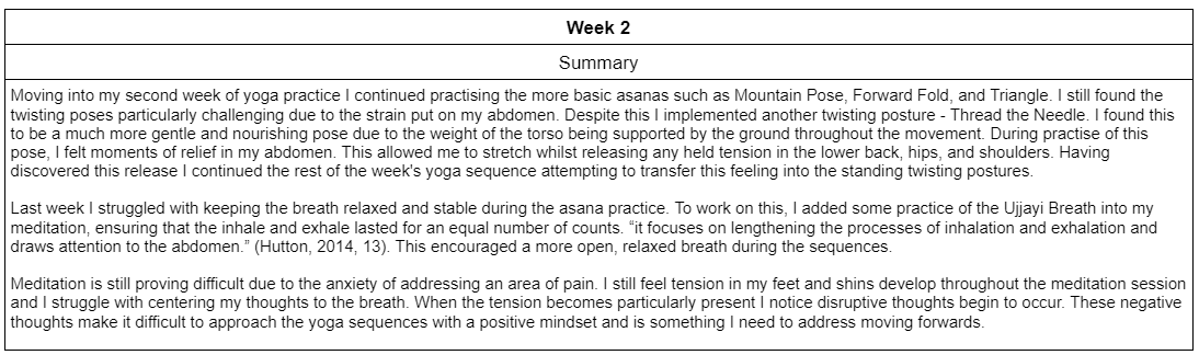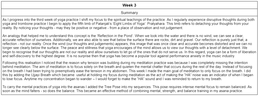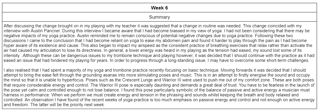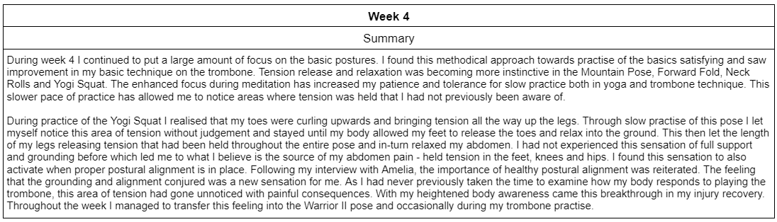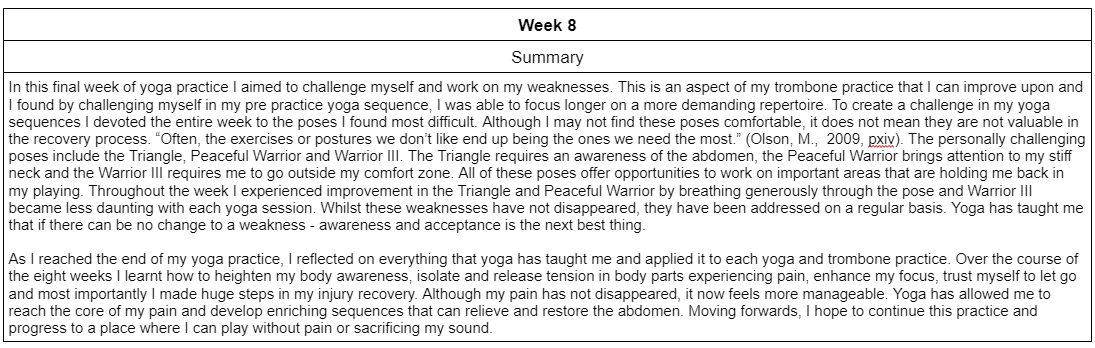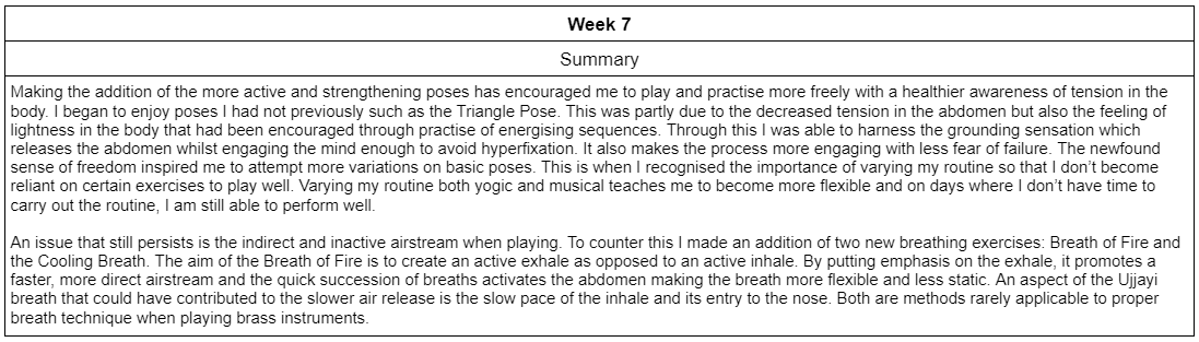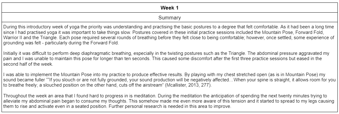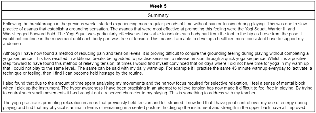 Through dealing with consistent pain in my abdomen, I have become motivated to find a solution to both alleviate this pain and release tension from my playing. To pursue this goal I implemented daily yoga practice into my schedule for eight weeks to measure how effective it can be as a method of reducing the pain and tension present in my playing. Each day a twenty minute yoga sequence was practised along with an additional five minute meditation or breathing exercise. The sequences varied in its variety of asanas and the difficulty progressed over the course of the eight weeks. Alongside this, a diary was kept to record any notable realisations and changes in the pain/tension felt. Throughout the eight weeks a methodical physical process was developed in my practice to reduce tension with successful results. There were some temporary negative consequences to my technique as the regular practice of nasal breathing lowered my airpspeed and tone quality reduced in intensity. However, these repercussions were brief and pain/tension levels were reduced. A summary of the relevant findings from each week is presented below: