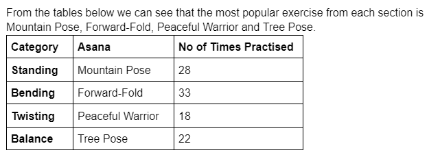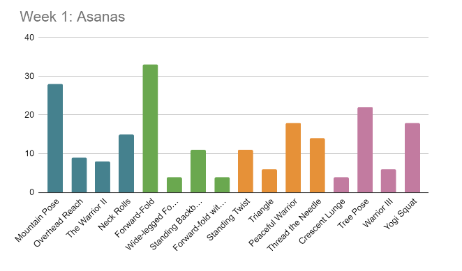 Once the participants completed their first BodyMap survey, they were given a practice diary to record which yoga exercises were practised each day. The diary included a list of 16 asana poses and 4 pranayama (breathing) exercises with a link to a GIF demonstration embedded to each exercise. A description and explanation for why each exercise was chosen is included in the personal case study. The 16 asana poses were split into four colour-coded categories (Figure 2.6) to differentiate their execution: standing, bending, twisting and balance. A guideline of 5 - 6 poses a day was suggested with a requirement for at least one exercise from each category to be practised each day. Underneath the asanas are descriptions of how to practise each breathing exercise. Below are the results of the amount of times each exercise was practised during the first week which gives us an insight into the popularity of each exercise.