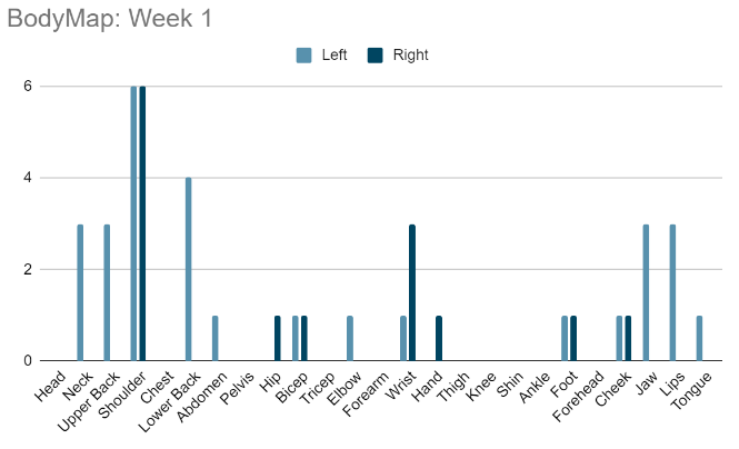 The results of the first week's bodymap shows that the shoulders are the most selected body part in all three areas. They were selected by three participants as a pre-existing area of pain/tension/discomfort, six participants as a current area of pain/tension/discomfort and six as one of their three body-parts experiencing the most pain/tension/discomfort. These results align with existing research including a case study investigating “The high prevalence of playing-related musculoskeletal disorders (PRMDs) and its associated factors in amateur musicians playing in student orchestras: A cross-sectional study” (Kok et al., 2018). In this study 59 of the participants were brass players and similarly, the body part that was selected the most as an area of PRMD prevalence were the shoulders with 28.8% of the group experiencing a PRMD in that area. It is important to note that the musicians who took part in this study were amateur musicians as opposed to music students and the physical demands will be higher for the participants of my case study.