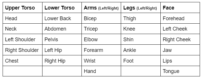 The participants were then asked how many hours a day they were playing on average throughout the week. The answers ranged from the highest being 5 - 6 hours a day and the lowest being 45 minutes. Next, they had to select any areas of the body where they felt pain/tension/discomfort during playing throughout the previous week. The 27 body parts were split into five categories (Figure 2.3):