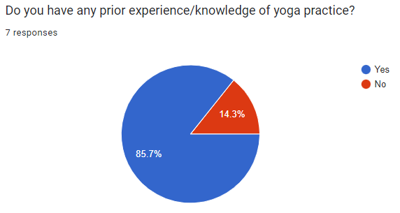 The participants of this case study consist of seven brass musicians at a postgraduate level. The instrument division is two trumpet players, two trombone players, two french horn players and one tuba player. Two of the participants are in the process of receiving their master's degree and another has graduated from a masters. The group contains three male-identifying musicians and four female-identifying musicians. The gender ratio is balanced for each instrument except for trombone (two female participants) and the tuba participant (only one male participant). In the group, six of the seven participants had experience with yoga (Figure 2.0) however most reported irregular frequency of practice with only one reporting regular yoga practice “Have practiced yoga frequently for the past four years”. Four of the seven participants reported having experienced an injury or pain during practice of their instrument (Figure 2.1).