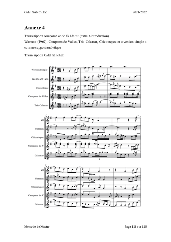A more detailed study of ornamentation in Huapango can be found in Sanchez´dissertation. To the right there is a reproduction of an ornamentation "chart" made out of several versions of the Huapango song "El llorar" taken from the most relevant audio-sources, including the recordings by the Institute of Anthropology and History of Mexico and Los Camperos de Valles (Sanchez 2022, 118)
