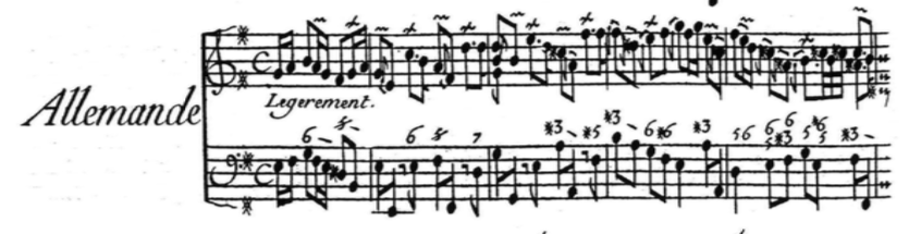 There is a big presence of grace notes and trills, which reinforce the rhythmic character of the violin line, as found in quick French dances from the XVIII century. All of the grace notes are executed quickly, with a smaller value than the main note (historical performers would call this "Lombardic" rhythm, as in XVIII music resembling northern Italian style). There was a big amount of grace notes recalling the "tierce coulé" found in French music from the XVIII century, that is, an ornament filling in an interval of a third.