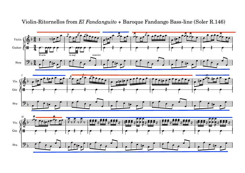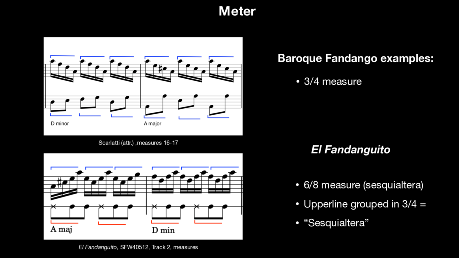 The similarities between the melodic lines are evident. The big difference between the selected examples of the XVIII century fandango and "El Fandanguito" lies primarily in the metric. The European Fandango is written in simple triple meter (3/4), with both the top line and the bass line clearly distributed in groups of 3 quarters per bar. In "El Fandanguito", however, the accompaniment strums in the compound meter of 6/8 while the chordal sixteenth notes of the melodic line are grouped in quarters. This creates the polyrhythmic feeling of 3 against 2 known as "sesquialtera". In the following image, the blue shows ternary and the red binary groupings: