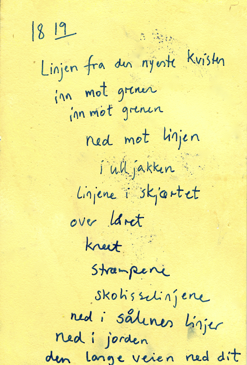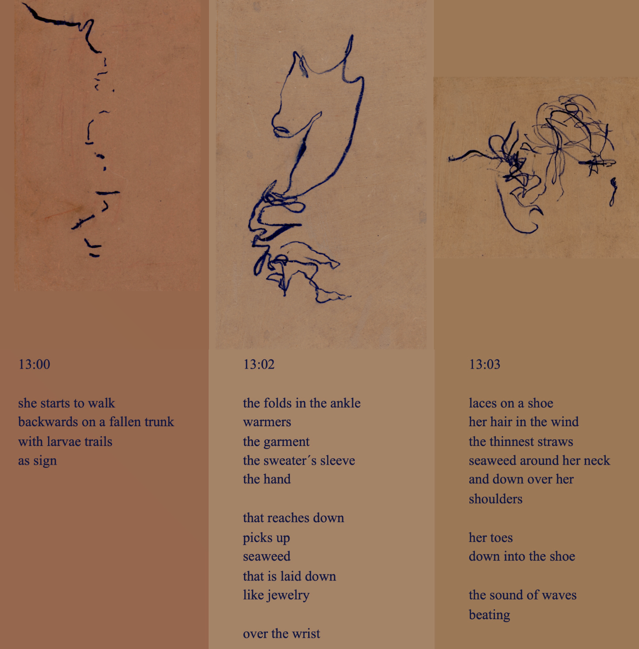 "The drawing gaze does not judge, it only sees. There is no difference in the line along the arm that continues out into a bunch of seaweed or into a fold in the sweater, yes, maybe into the anatomy and then moves out into the fleeting water lines. These movements are a stream, but I still have to stop and look down, to note the time and write down what I just saw. A moment is documented and left where it happened."