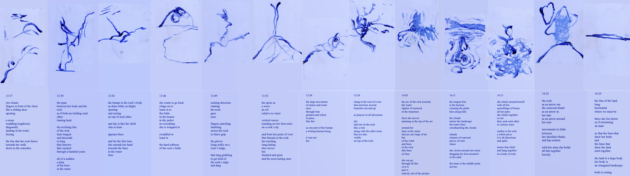 "The drawing gaze does not judge, it only sees. There is no difference in the line along the arm that continues out into a bunch of seaweed or into a fold in the sweater, yes, maybe into the anatomy and then moves out into the fleeting water lines. These movements are a stream, but I still have to stop and look down, to note the time and write down what I just saw. A moment is documented and left where it happened."