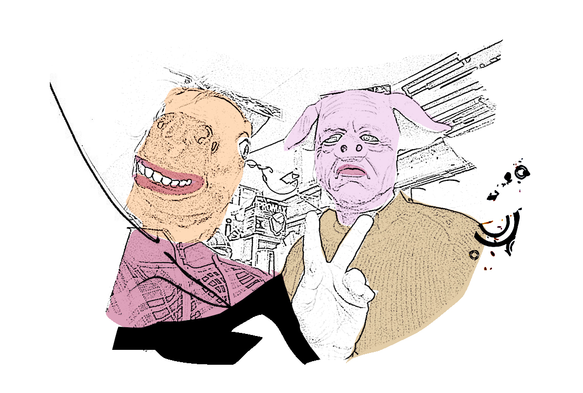 A staged re-reading of a political speech. The speech is ‘filtered’ through the story of the animal farm. One of the musicians reads the speech, while an actor portrays the dog on camera, wearing a dog mask. The filmed sequence is live-mixed with clips from a televised debate, where the heads of politicians are changed into animals. This section is followed by an artistic response where a song is performed, while at the same accompanying a solo dance bit.