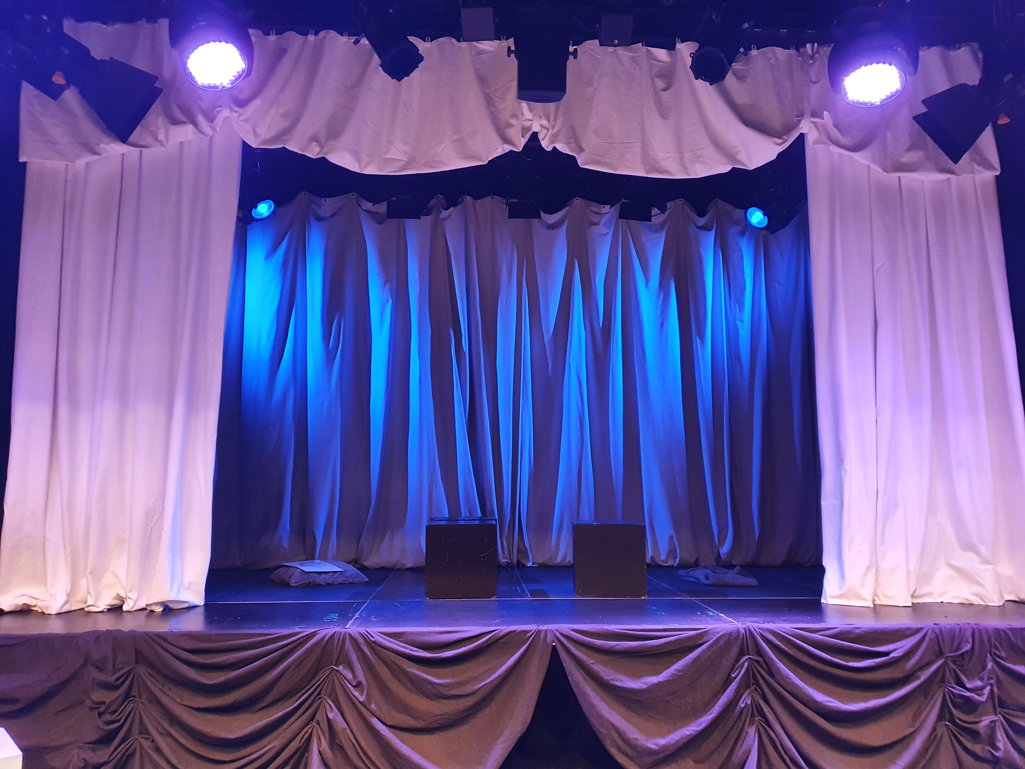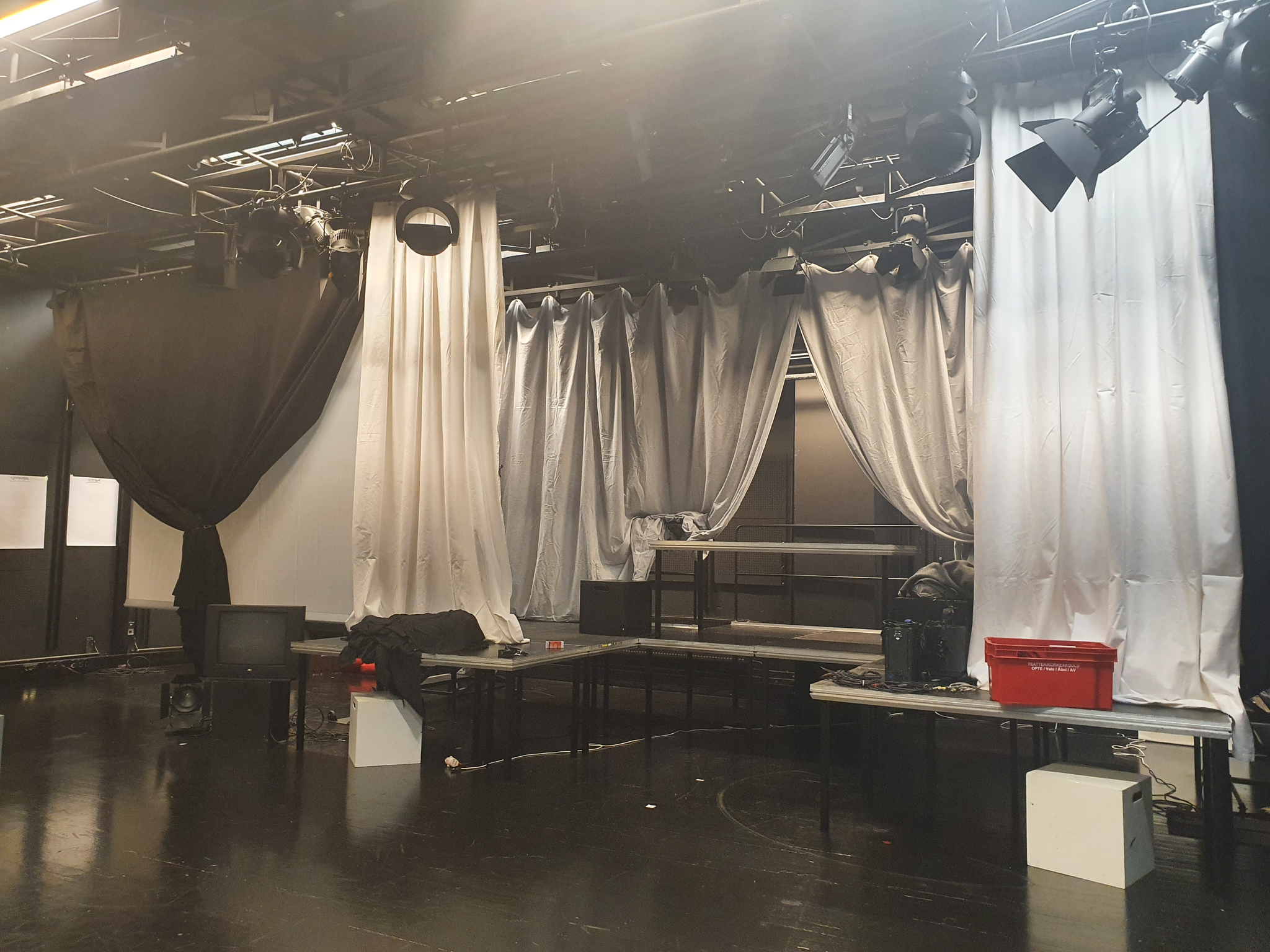 The task for a scenographer was to clearly separate two distinct worlds and layers of the play – memory layer and fictional\narrational layer. That is how the structure of theatre-in-theatre appeared. Magnús designed a built-in stage with a podium in the middle of a bigger stage. The smaller stage in the center was meant to represent a separated world of memories where M and V lived, and the main floor was designated for fictional characters and MC. There was also a liminal space – ‘the corridor’ – which plays a very important role in Neptune. The corridor is a space of love and vulnerability where M and V find themselves only in their most honest moments. This is also a place where MC makes her confessions. The corridor was basically a passage of light on the front stage that was activated in the key moments of the play. As for the color scheme, the set was also specifically designed as black-and-white, with white and grey movable cubes on the floor and white curtains on the built-in centerstage. This was done to represent two things – fading of memories as a background, and, interestingly, paper. Since the light motive of Neptune was trying to write a play, everything that happens on stage becomes a part of this writing attempt – with actual sheets of paper lying around on the floor, and the rest of materials resembling white blank pages.